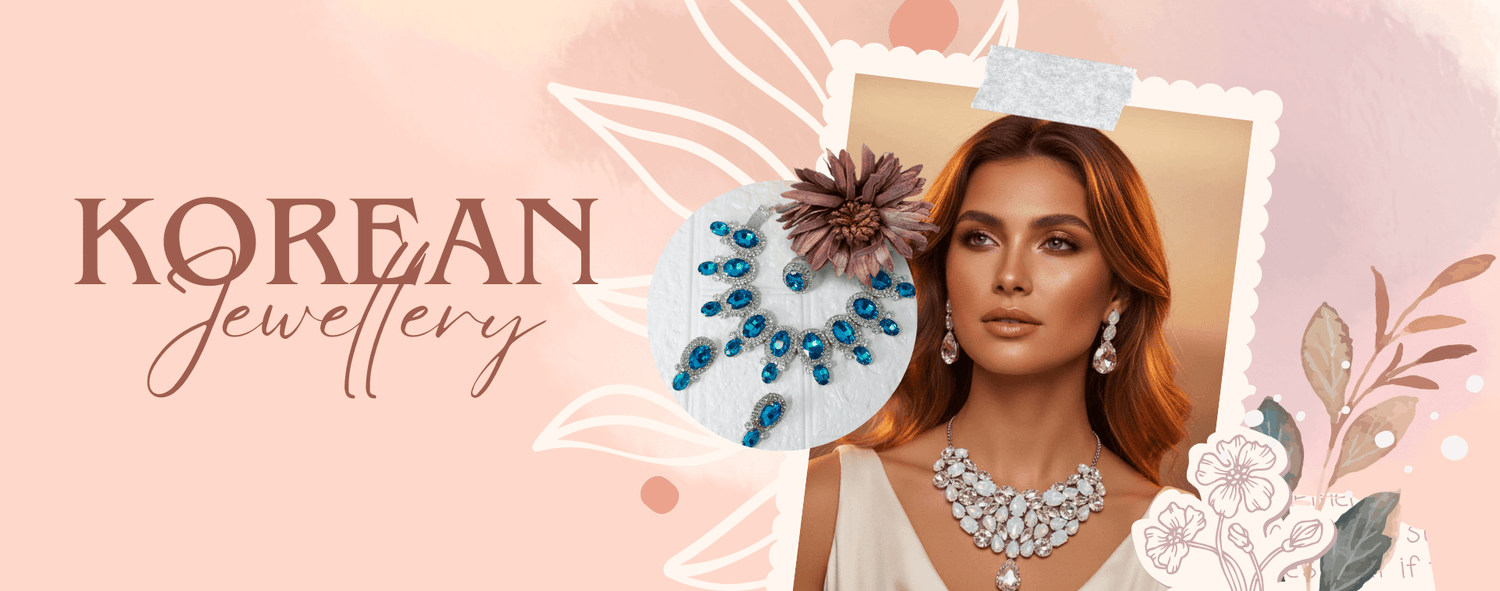 Korean Blue Floral Glass Stone Jewelry Necklace Set | Rhodium Plated Statement Jewelry with Earrings