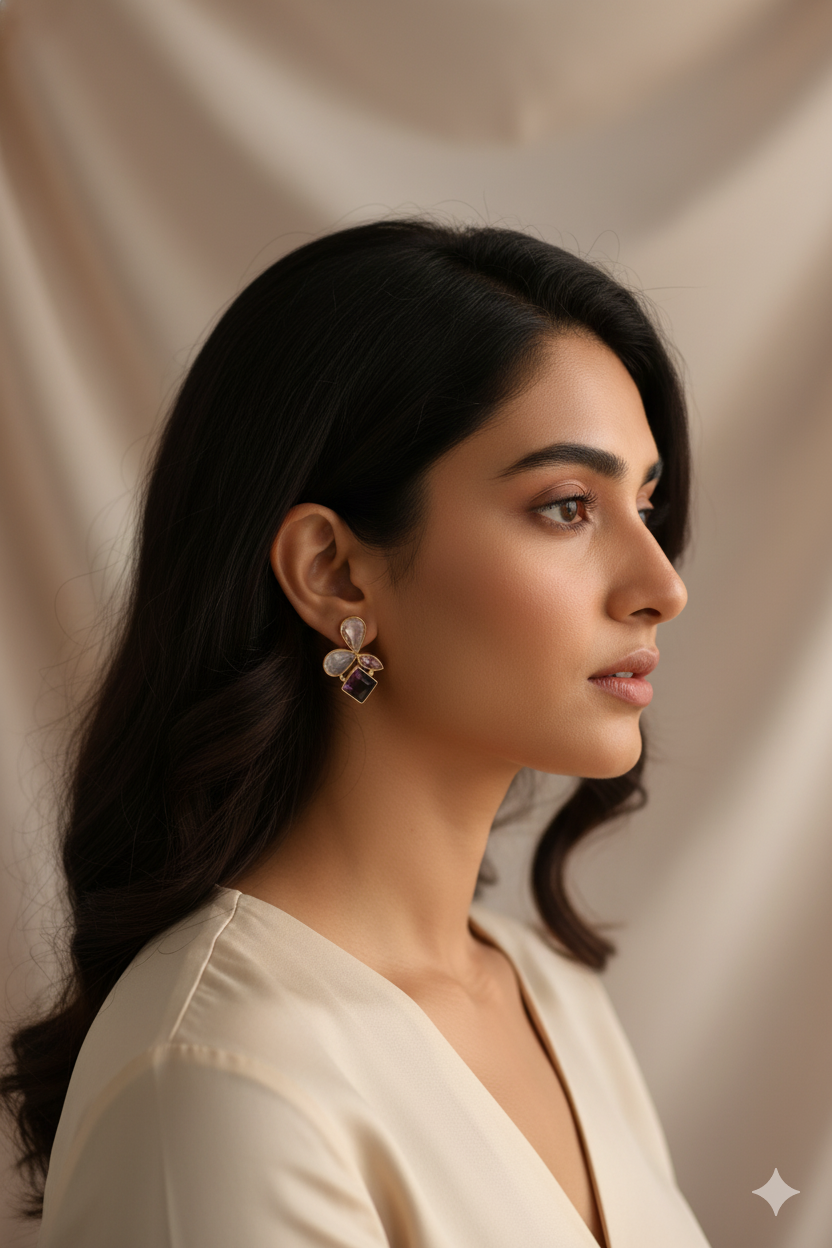 Elegant color‑play—deep amethyst squares crowned with champagne and blush petal‑cut stones. Finished in anti‑tarnish gold‑plated brass.