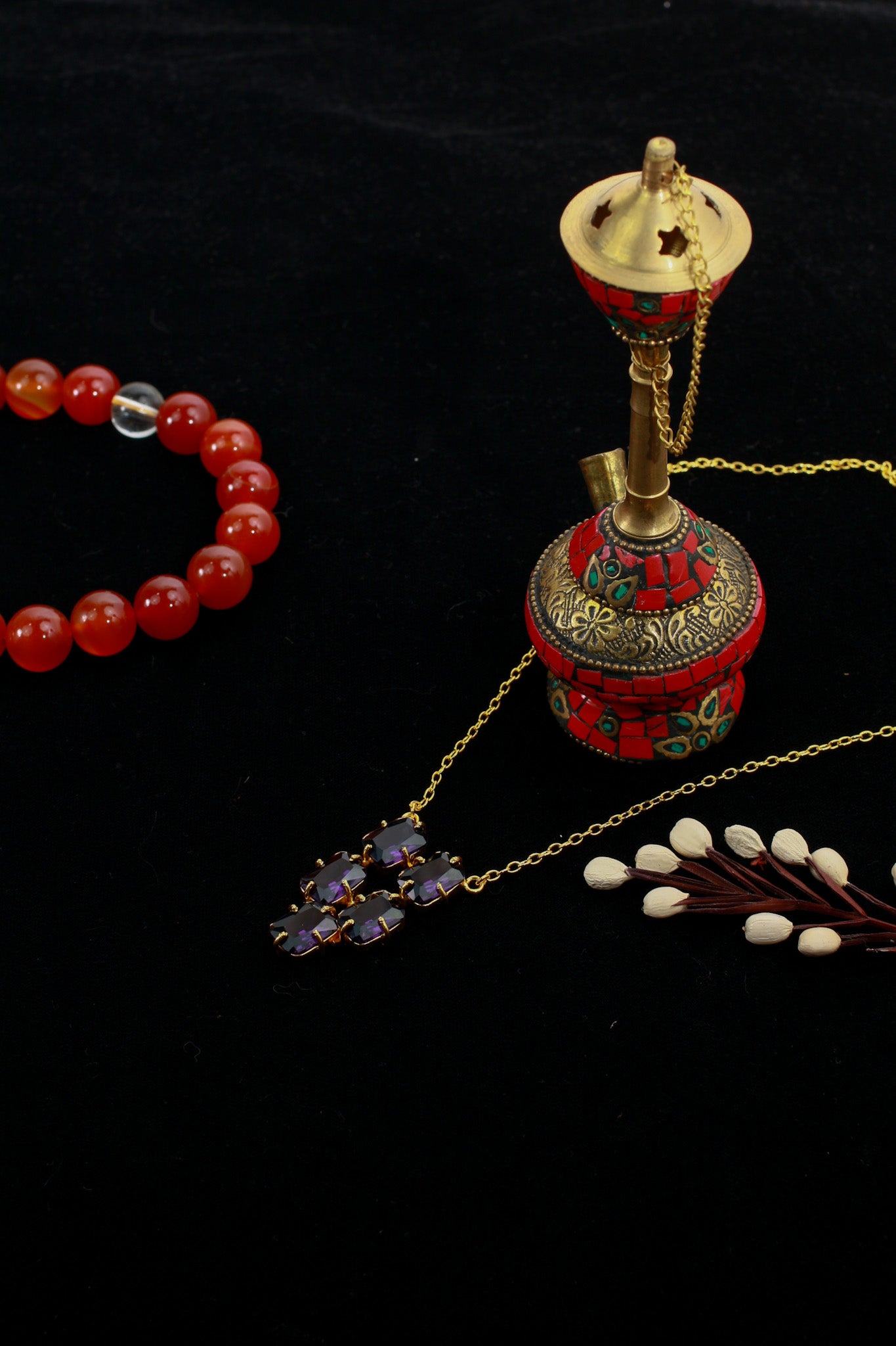 Bold and refined. This pendant features clustered amethyst stones set in a vertical arrangement, finished in gold-plated brass with an anti-tarnish protective coat.