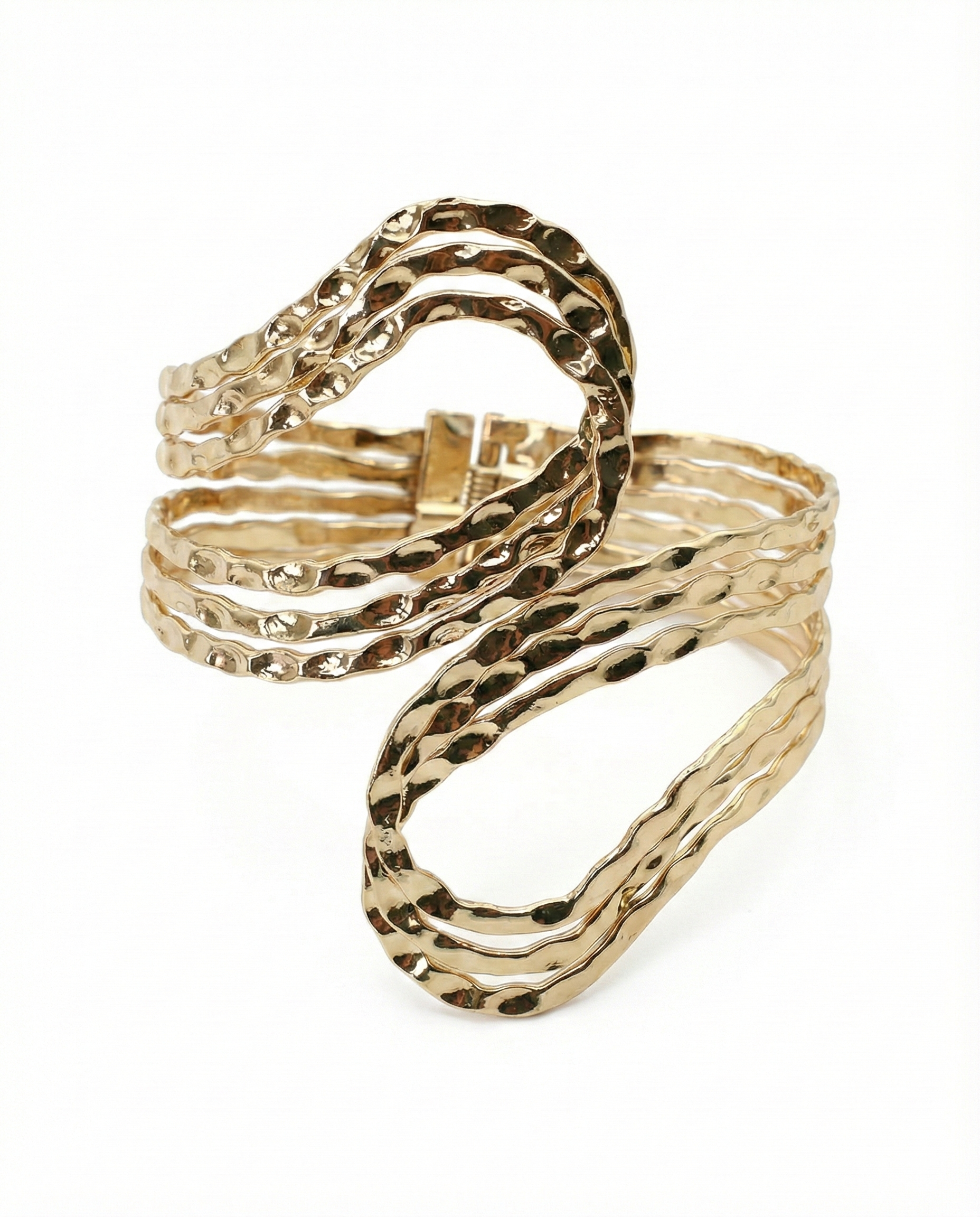 - Design: Multi-layer hammered wave cuff with a sculptural, fluid profile