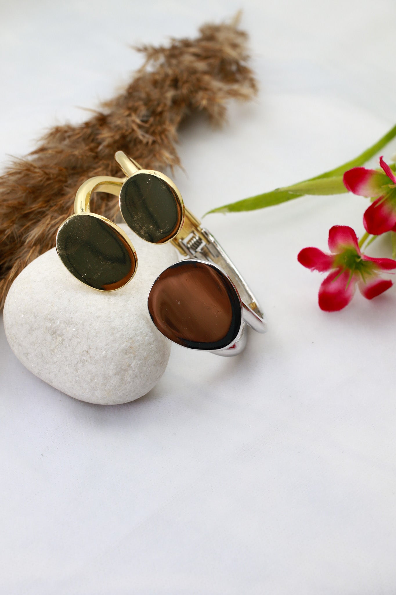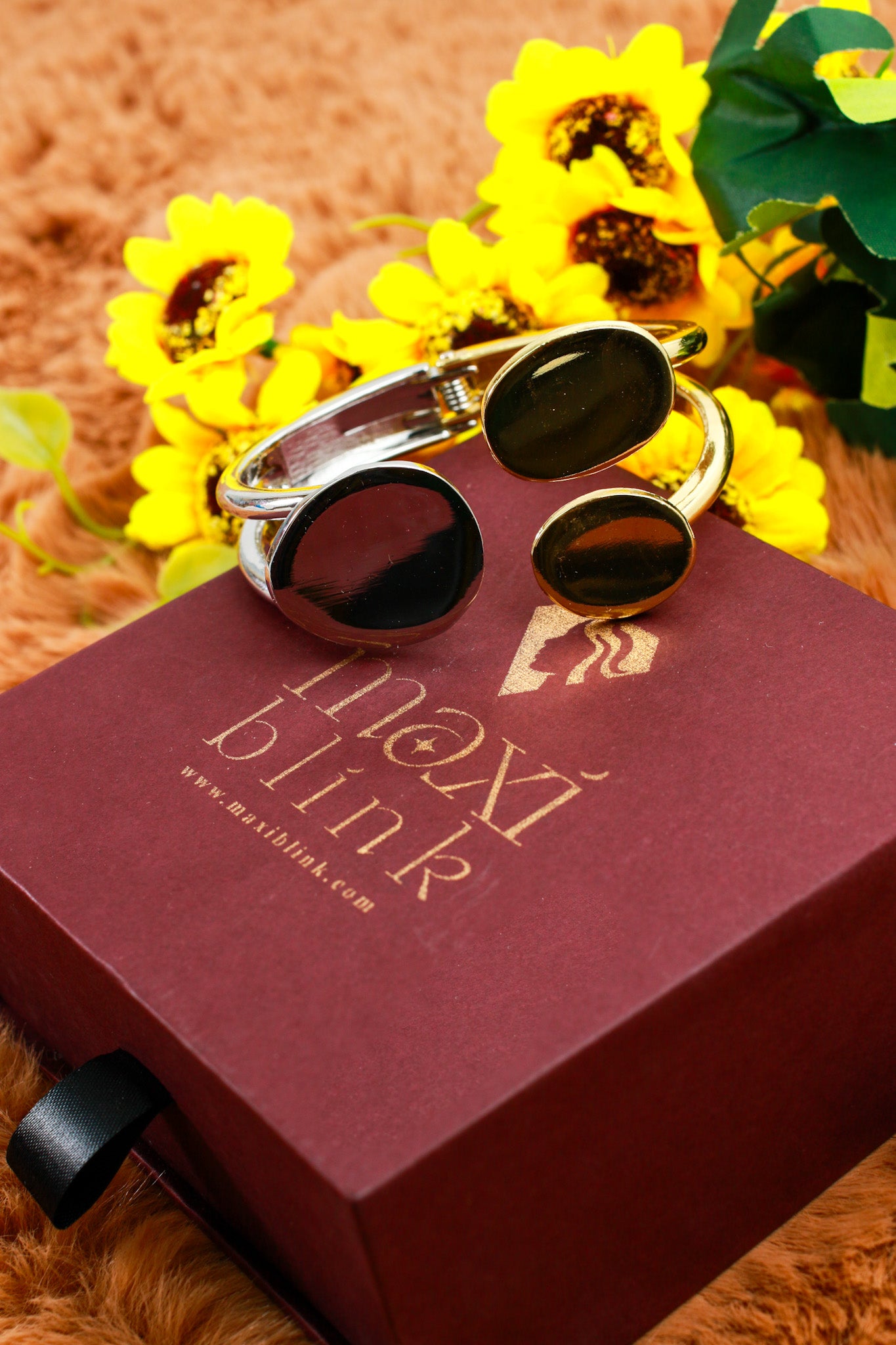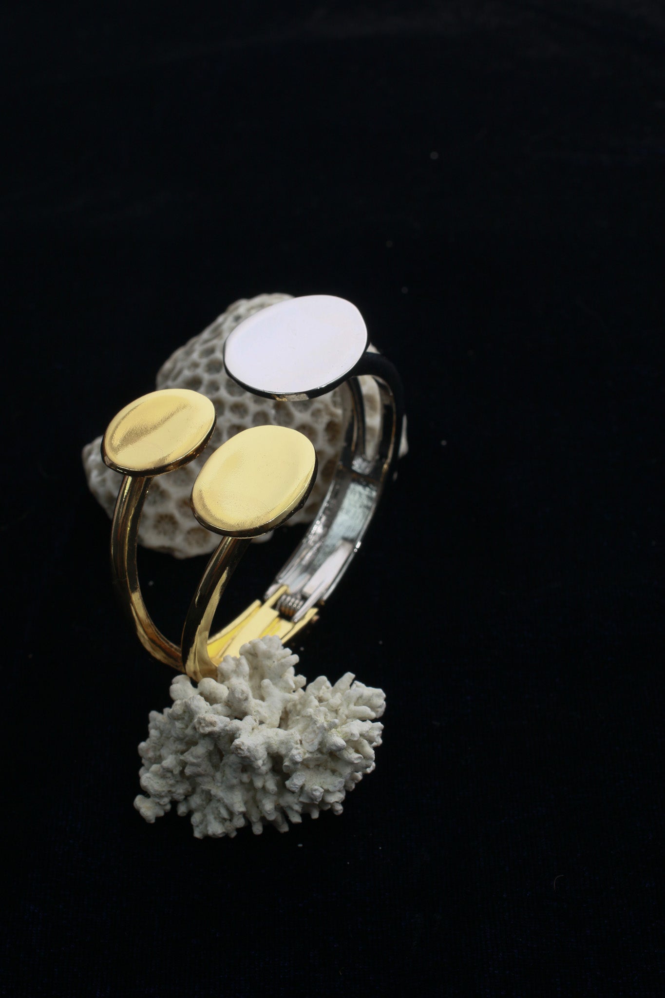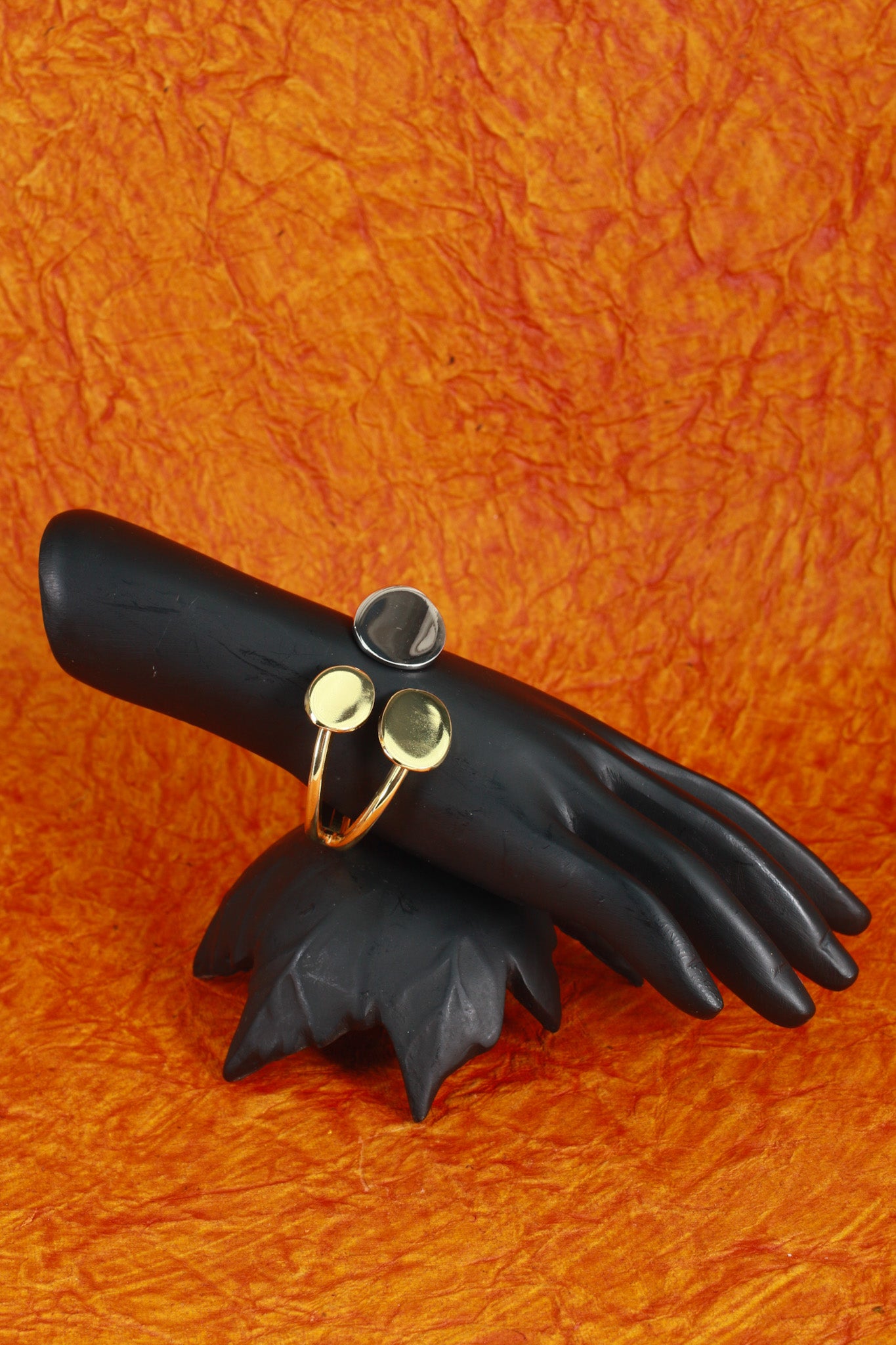 - Design: Geometric open-disc cuff with two gold discs and one contrasting silver disc