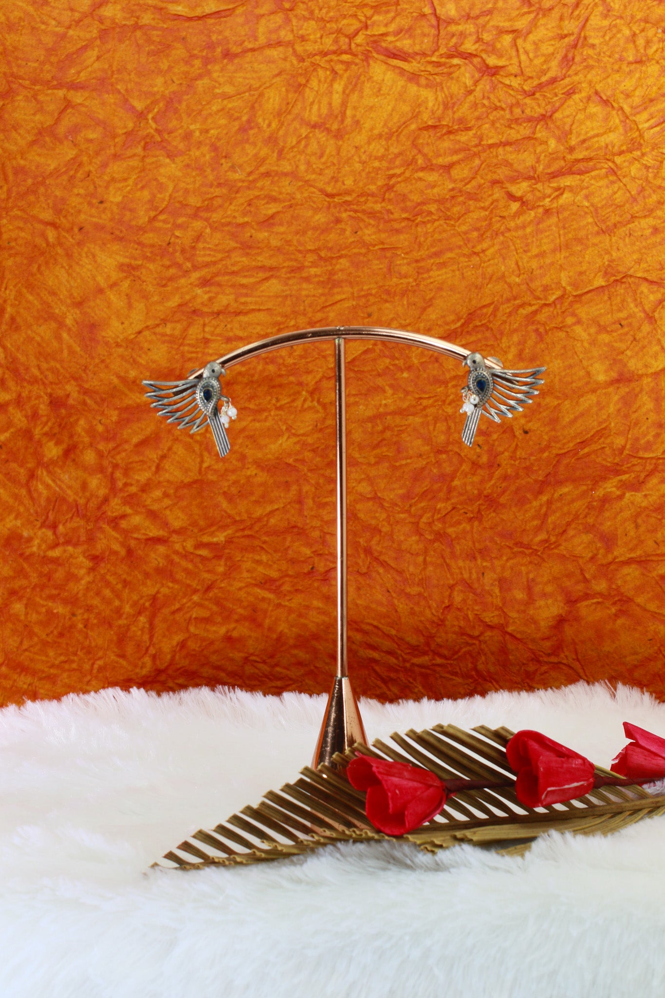 Unique bird-shaped oxidised German silver stud earrings featuring small blue Monalisa stones and pearl beads. Perfect for everyday ethnic elegance.