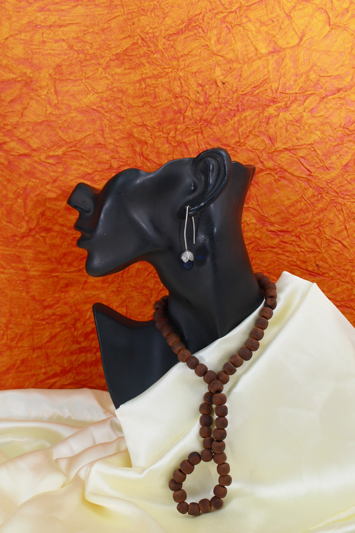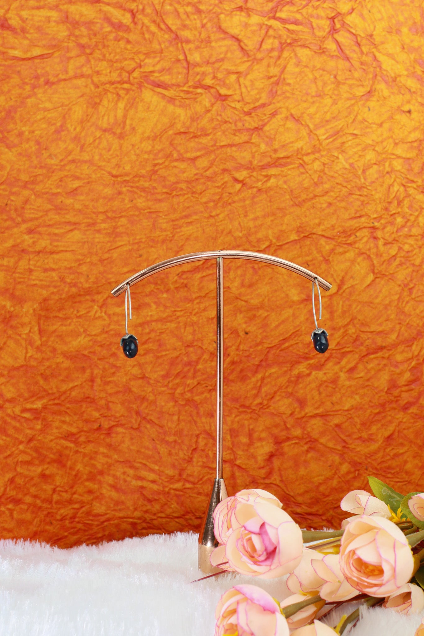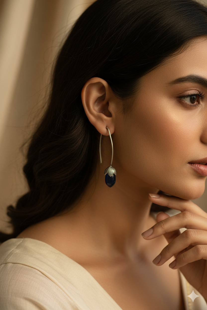 Elegant and minimal, these oxidised earrings feature a deep blue glass drop with leaf detailing at the top. Perfect for modern fusion looks or subtle ethnic styling.