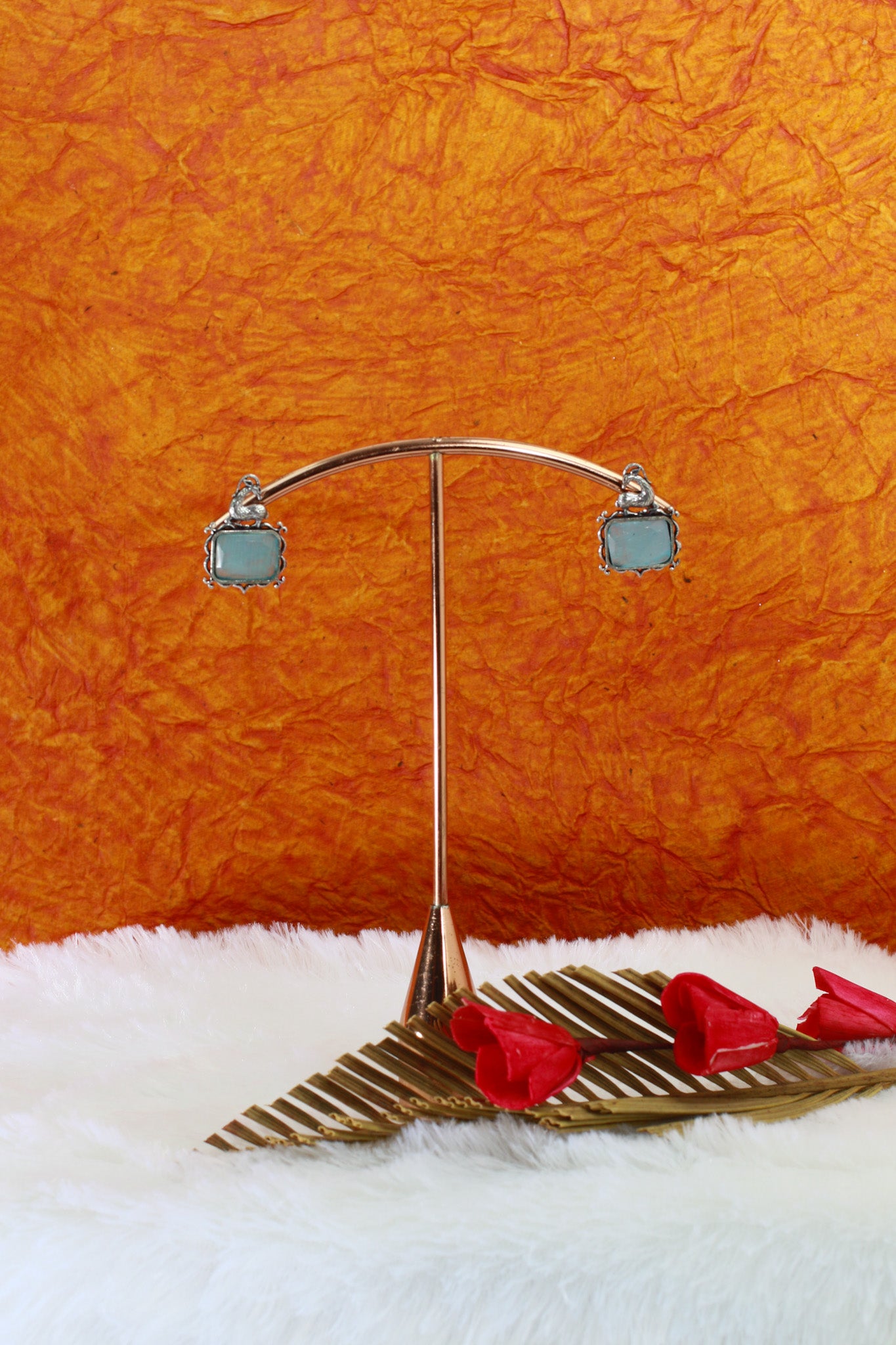 Statement oxidised earrings crafted in German silver with an elegant deer motif and glossy blue Monalisa rectangular stones. A striking blend of colour and vintage texture.