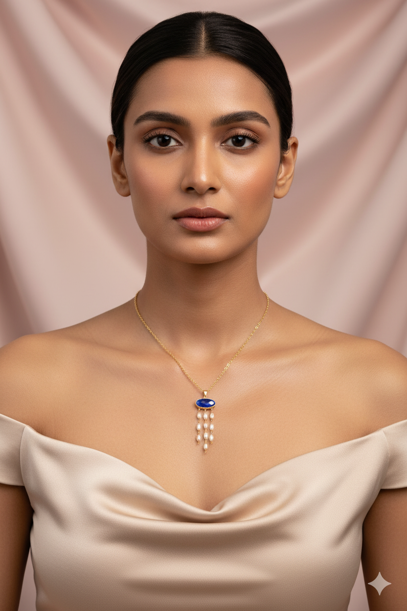 Effortless glam meets elegance. A royal blue natural stone is paired with cascading pearl tassels in a sleek gold-plated brass frame, complete with anti-tarnish coating.