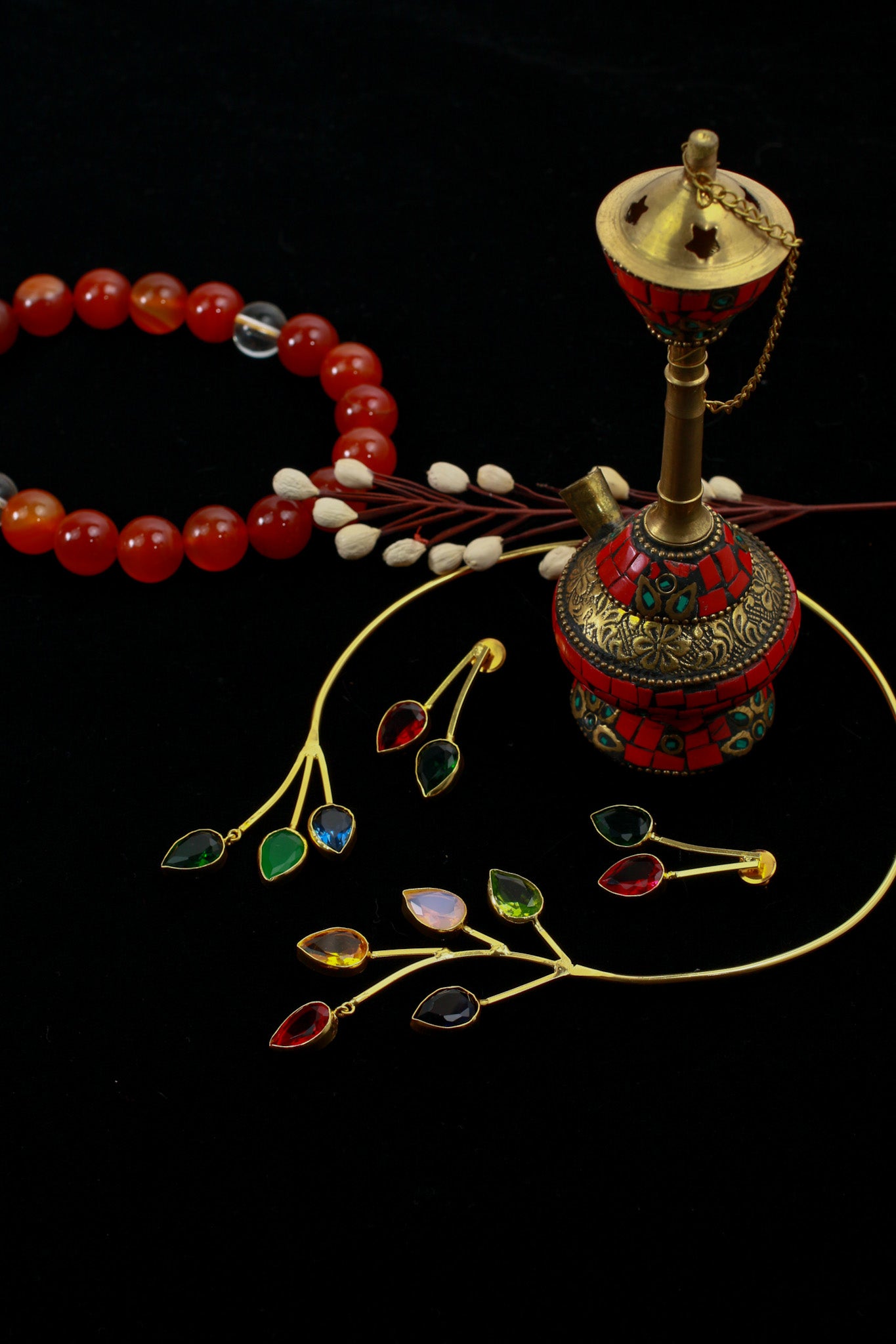 Nature‑inspired elegance—branching leaf motifs set with teardrop multicolor stones adorn this sculpted hansuli collar with matching Earrings. Finished in anti‑tarnish gold‑plated brass.
