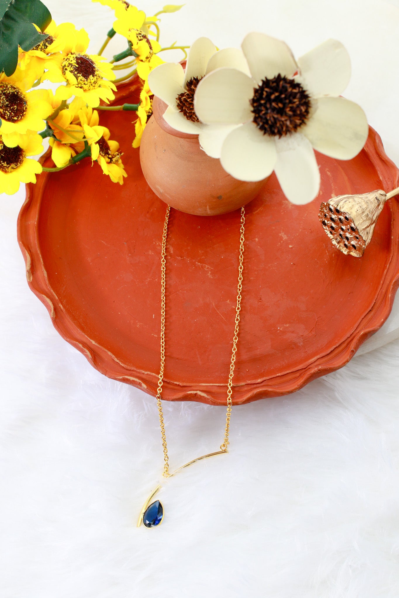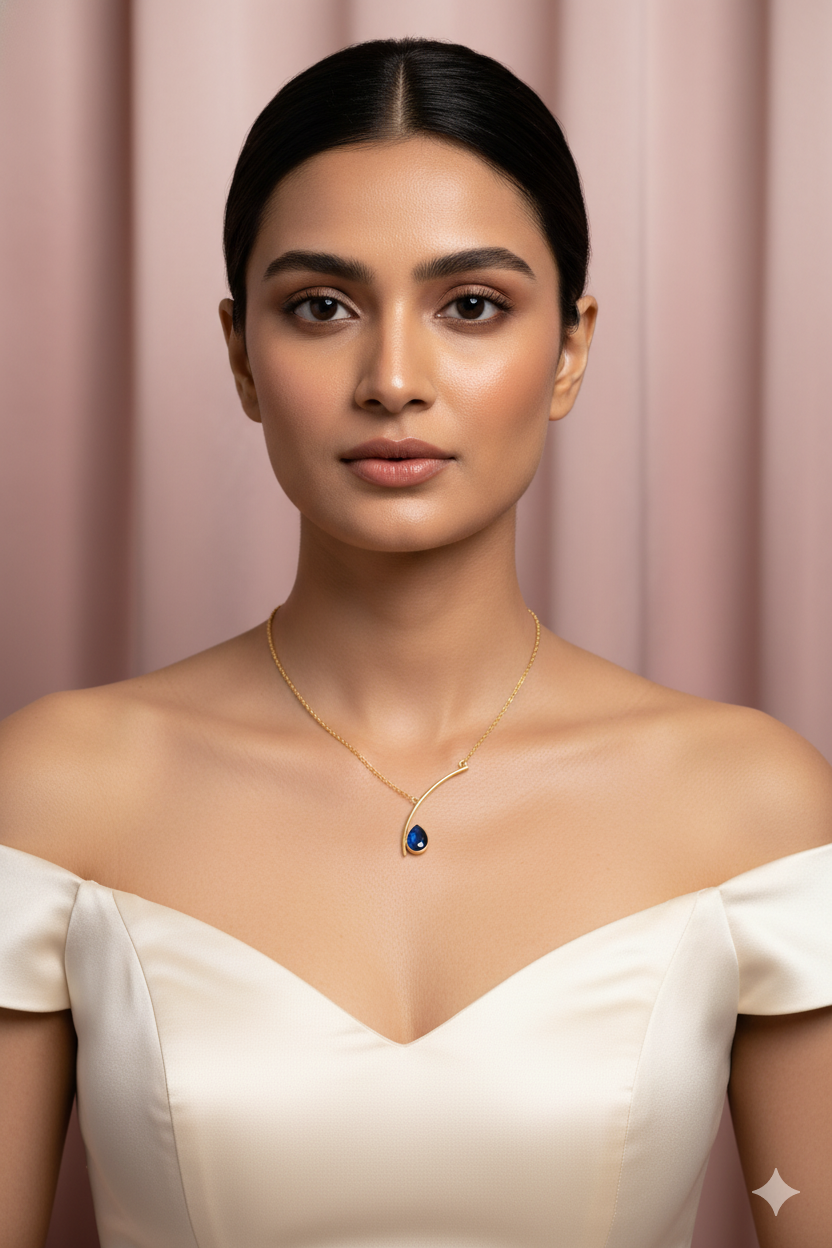 A sleek curved bar meets an ocean‑blue teardrop for timeless polish. Built in gold‑plated brass and sealed with an anti‑tarnish layer for everyday shine.