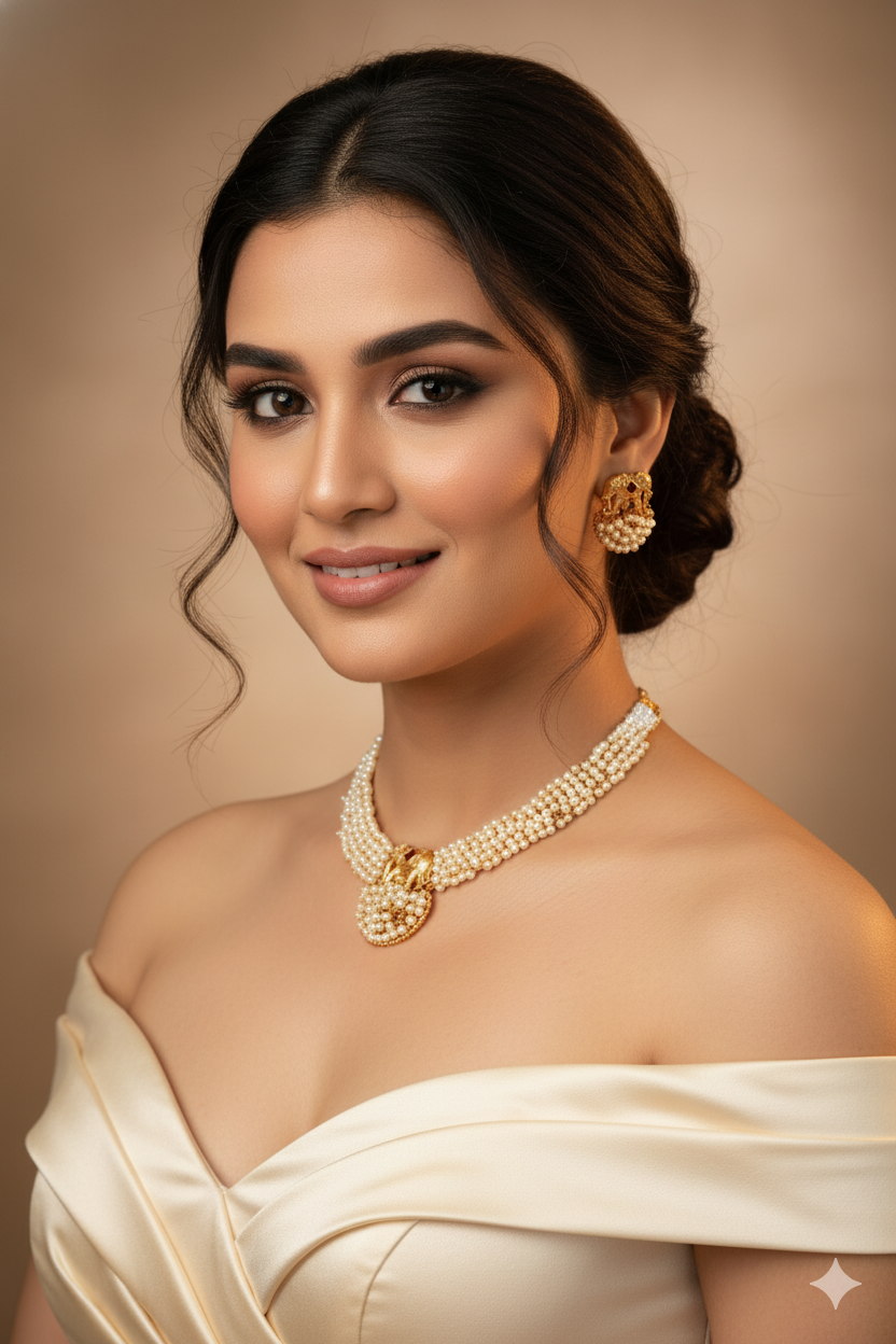 A heritage short necklace showcasing an elephant motif at the center with cascading pearl clusters. Textured coin links frame the neck for a rich, traditional appeal.