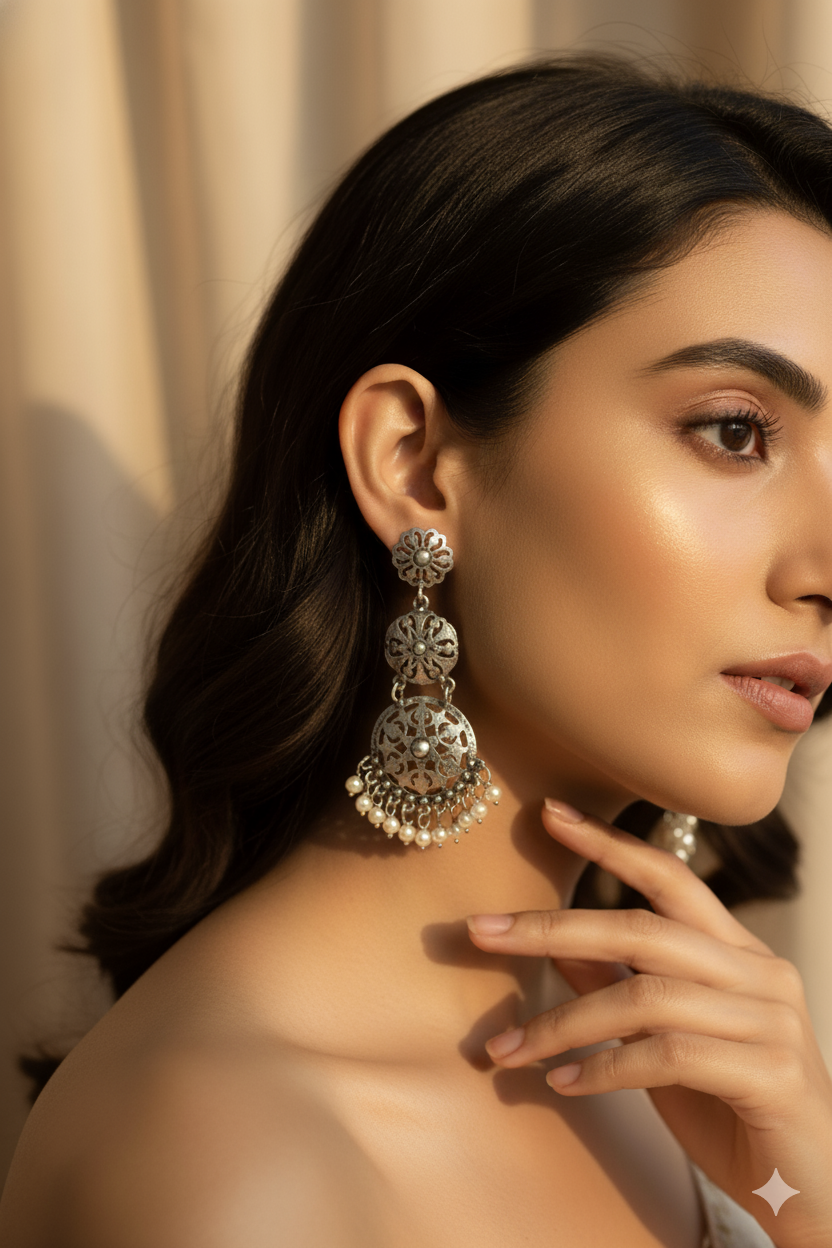 Chic oxidised earrings featuring cut-work circular motifs and pearl tassels. A perfect match for ethnic as well as indo-western outfits.