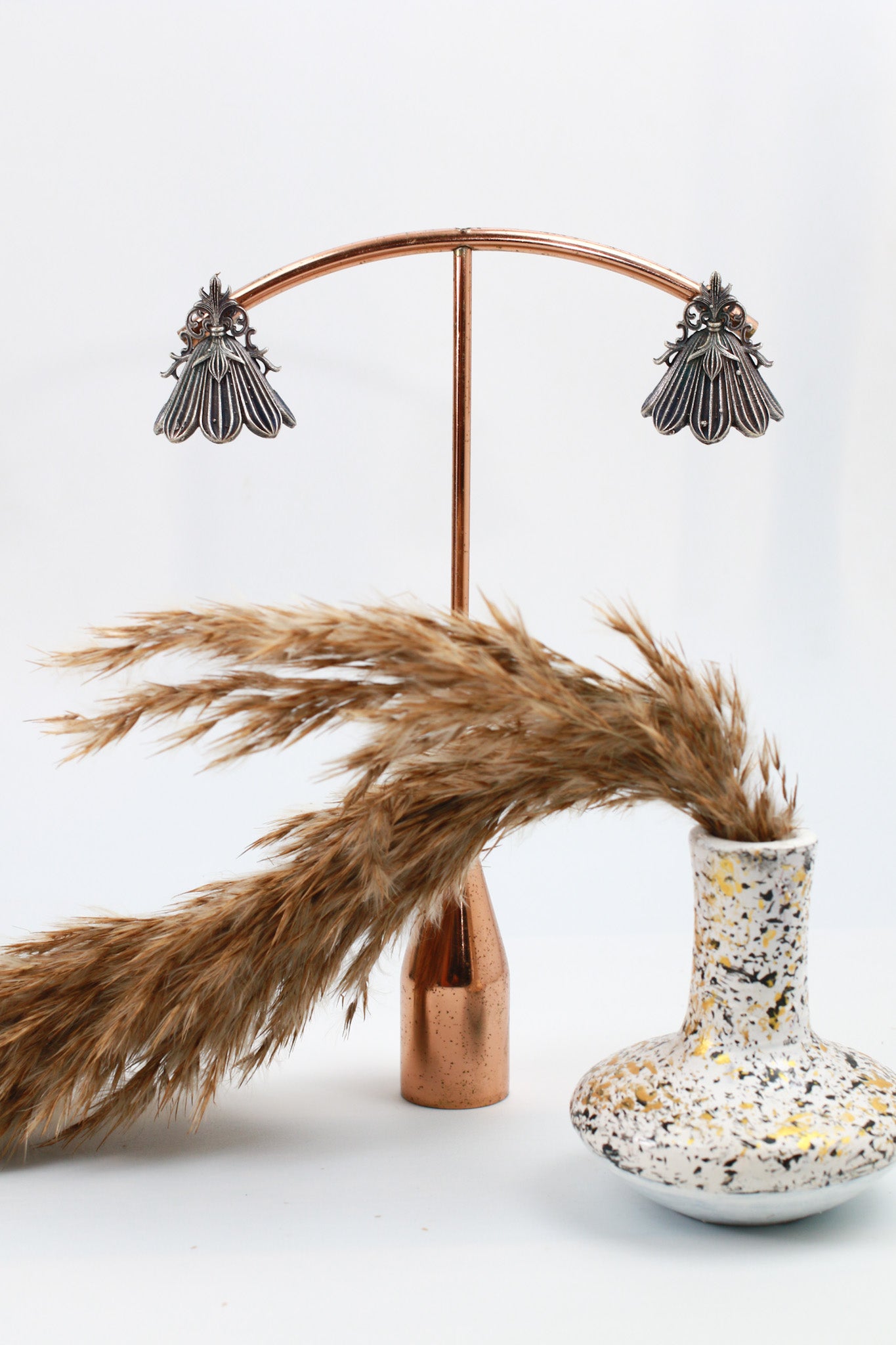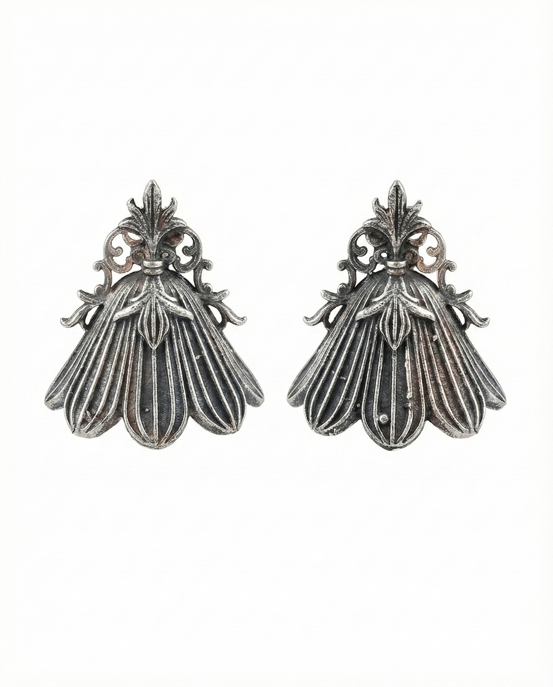 These elegant Floral Petal Oxidised Earrings feature a beautifully carved flower-inspired design with flowing petal detailing. Crafted in high-quality oxidised German silver, they bring a timeless ethnic charm to any outfit.