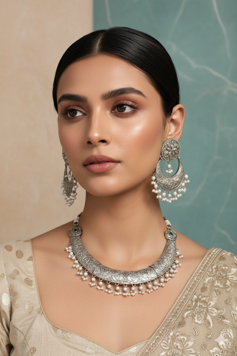Make a grand entrance with this traditional oxidised pearl jewellery set.