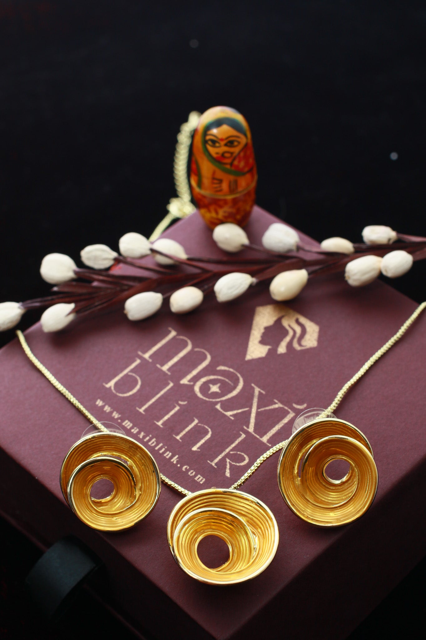 Modern, sleek, and timeless — this Gold Spiral Pendant Set from MaxiBlink captures the essence of bold sophistication. Featuring a smooth spiral design in high-gloss gold, the set perfectly balances minimalism and elegance. The matching earrings complement the pendant beautifully, making it a versatile accessory for both casual and festive wear.