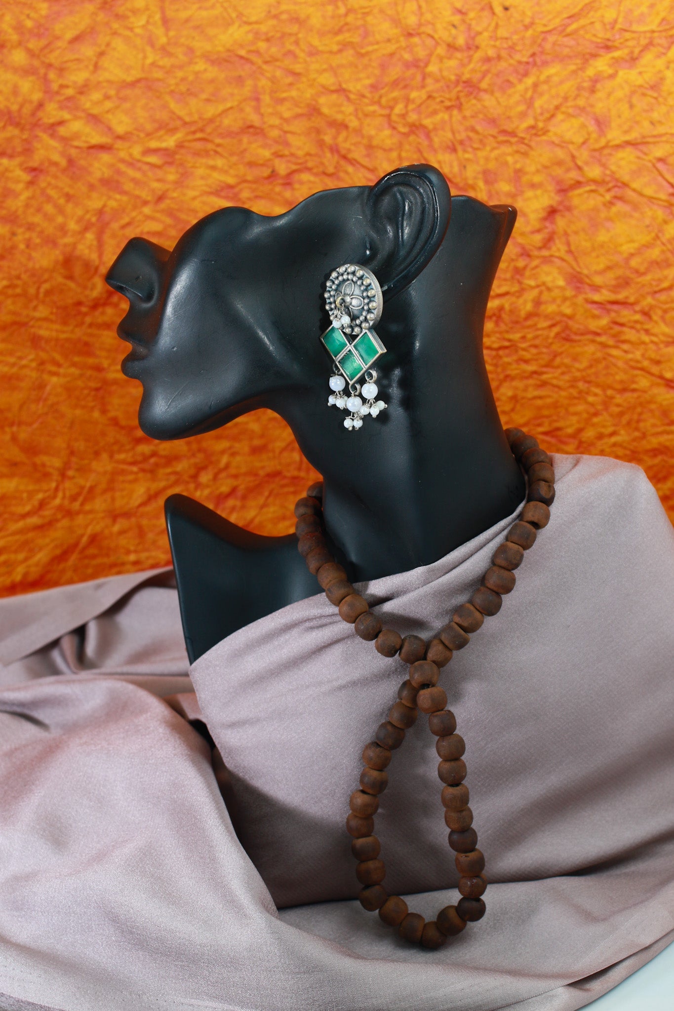 Trendy oxidised German silver stud earrings designed with square green Monalisa stones and pearl danglings. Ideal for festive and casual ethnic looks.