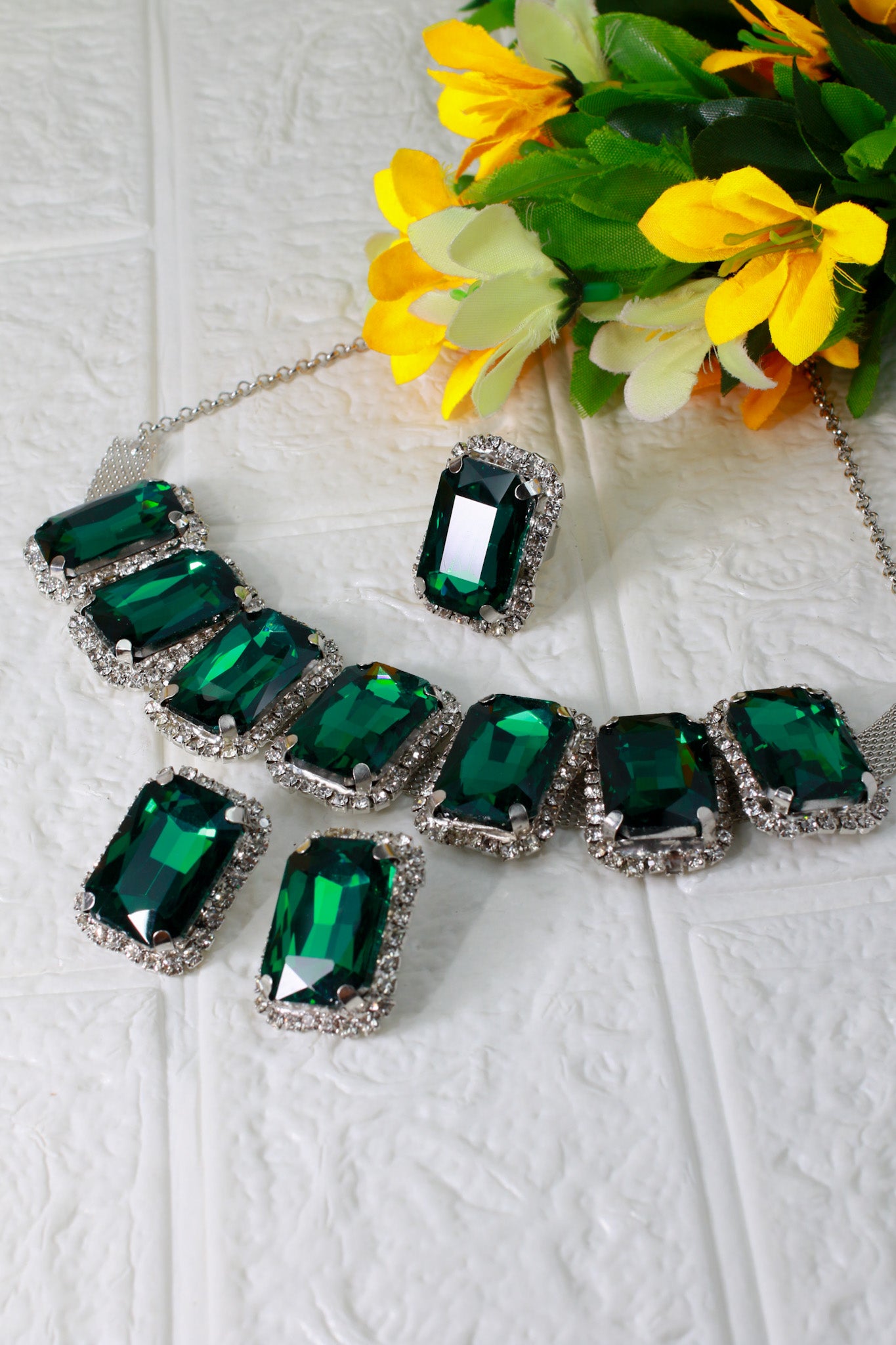 Showcase luxury style with this Korean Green Rectangular Glass Stone Necklace & Earrings Set. Featuring bold green rectangular stones, enhanced with rhodium plating, this set is perfect for bridal and festive wear.