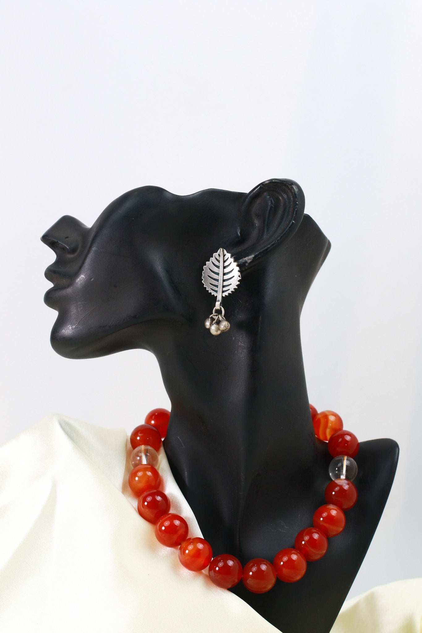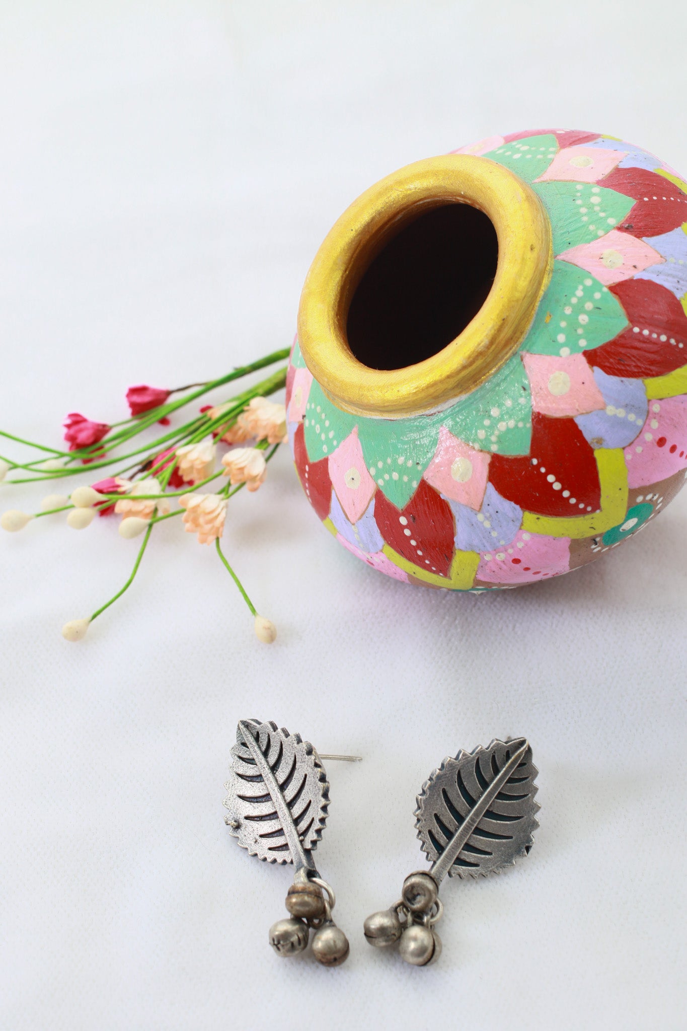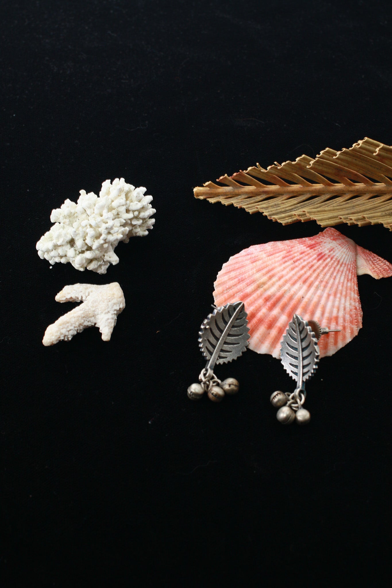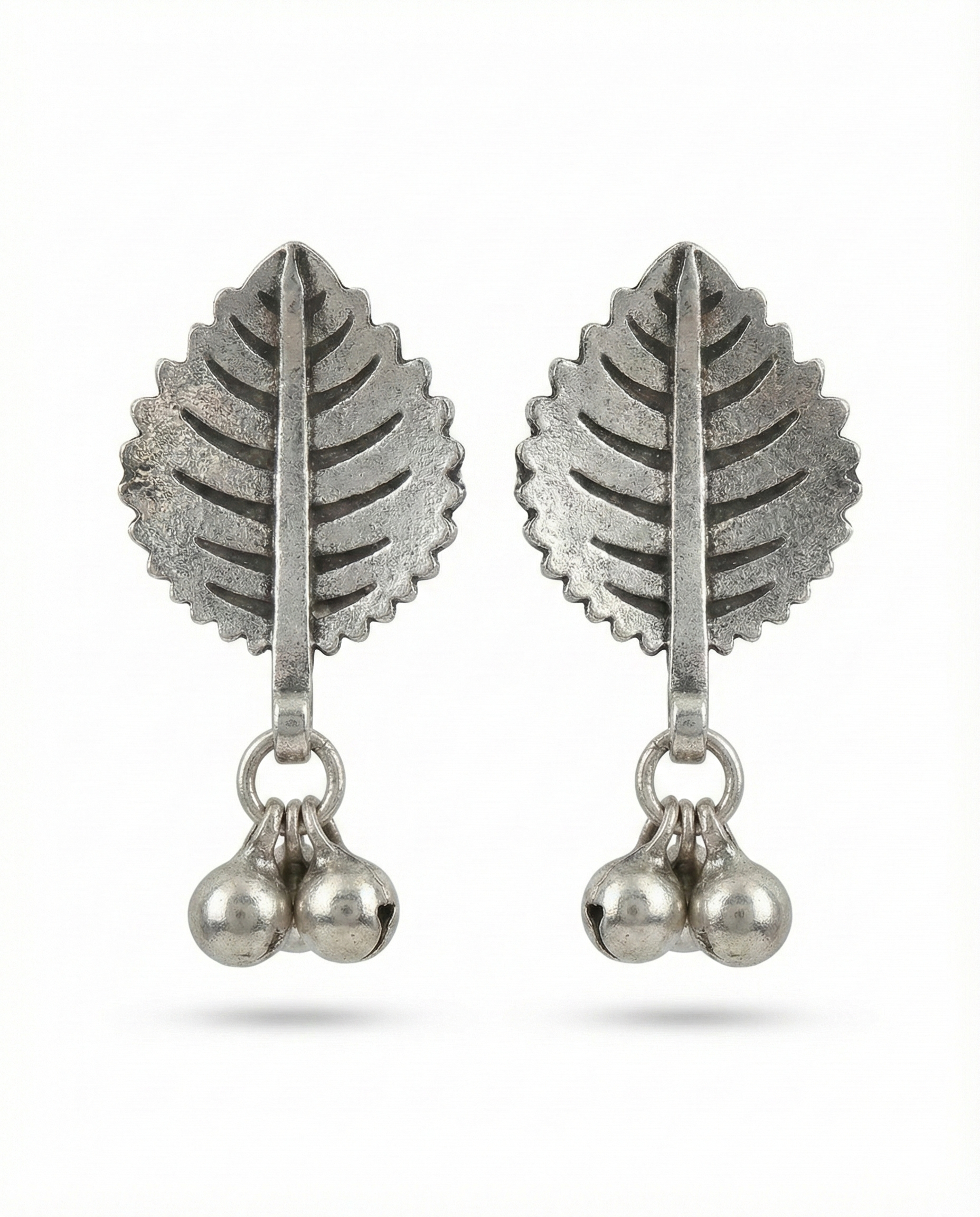 These elegant Leaf Dangling Oxidised Earrings feature a beautifully carved leaf motif paired with antique ghungroo-style drops. Crafted in high-quality oxidised German silver, the earrings add a rustic and artistic charm to any outfit.