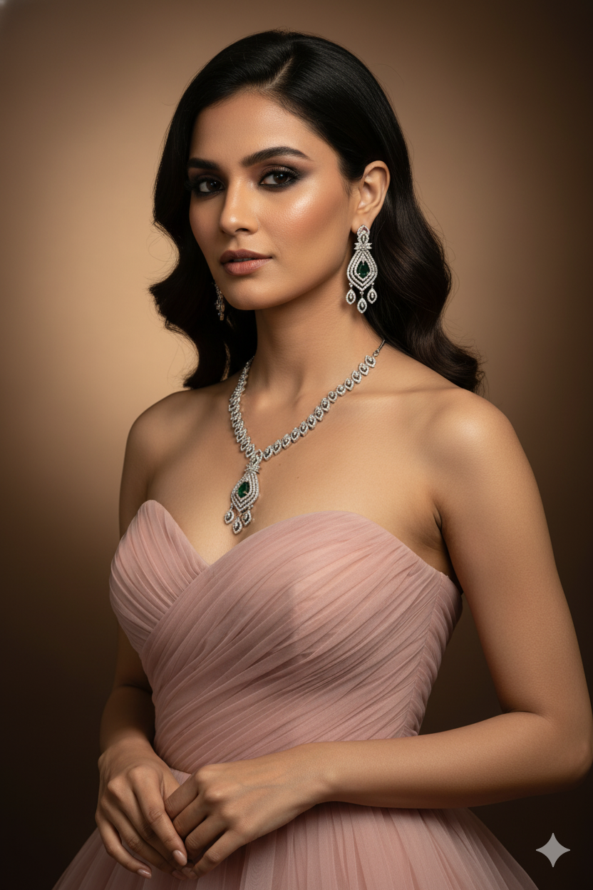 A sleek and sophisticated AD necklace featuring delicate leaf-like motifs and a central emerald green drop pendant. Includes uniquely shaped matching earrings for a chic ethnic look.