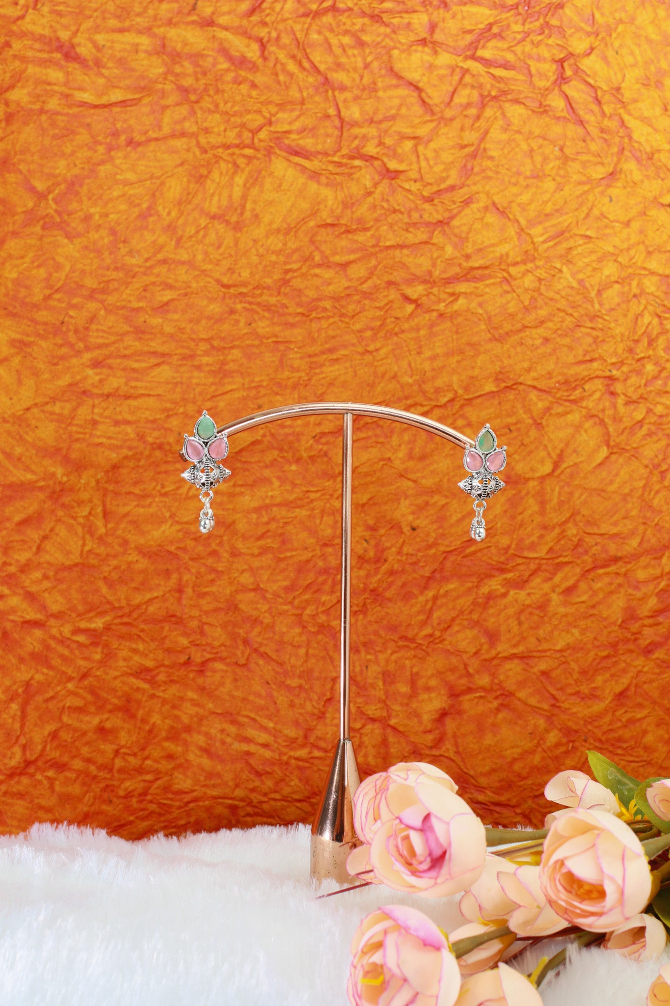 Cute compact cone drops with ghungroo cap and trio of pink & mint Monalisa stones. Lightweight everyday ethnic pick that still adds a pop of colour.