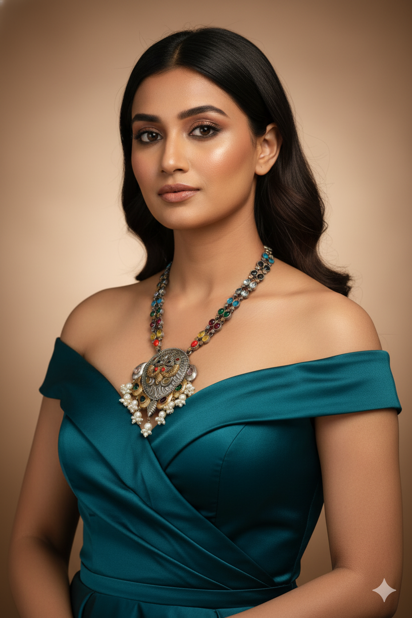 Make a statement with this handcrafted necklace showcasing a multicolor beaded chain and bold lion pendant. Made from oxidised silver-tone alloy, it’s a vintage-style treasure with cultural flair.