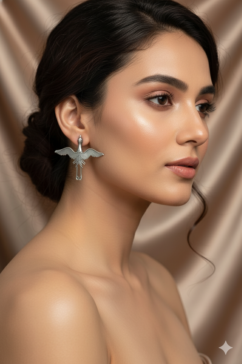 Product Description: Elegant oxidised earrings featuring flying bird motif in long drop style. A unique ethnic accessory for festive and party wear.