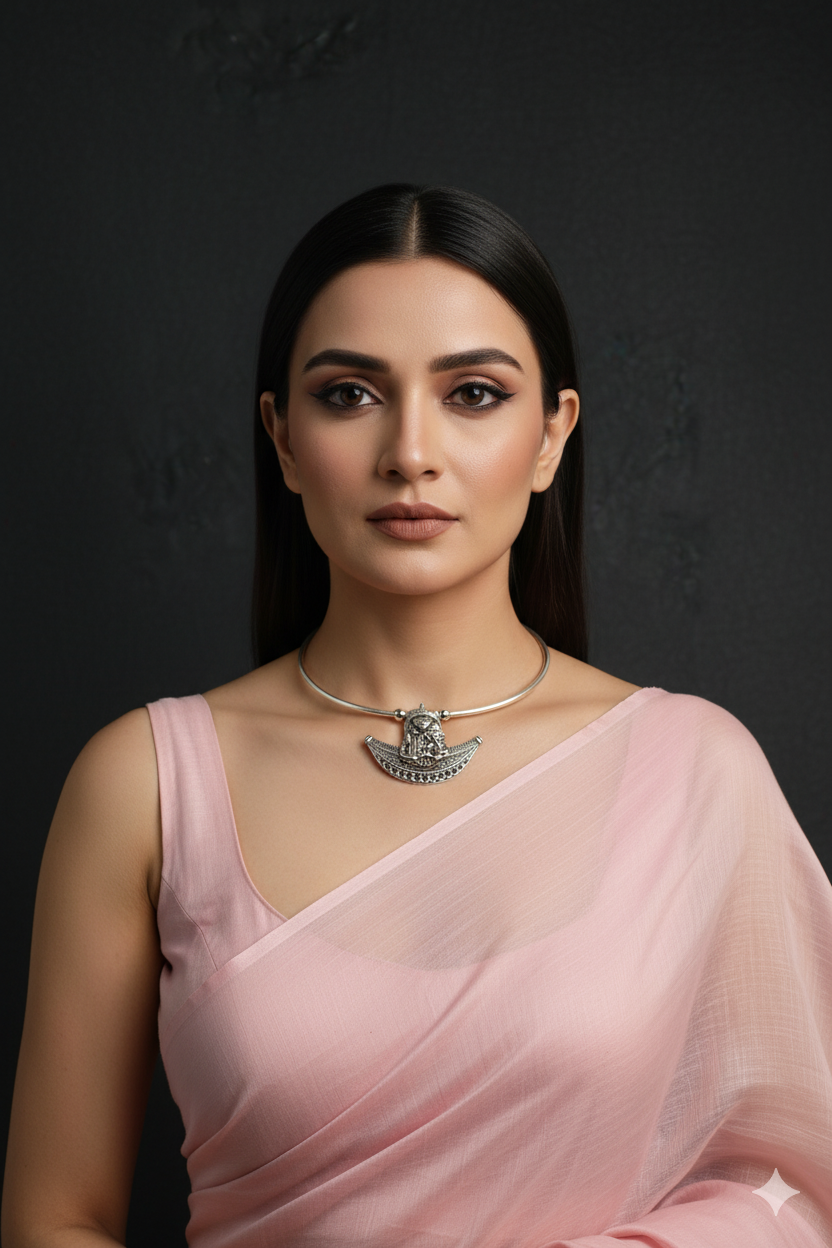 Product Description: Traditional Indian oxidised German silver hansli style necklace with goddess motif pendant in oxidised silver finish. Crafted from durable brass alloy with oxidised silver plating, this statement neckpiece is perfect for ethnic, festive and party wear.