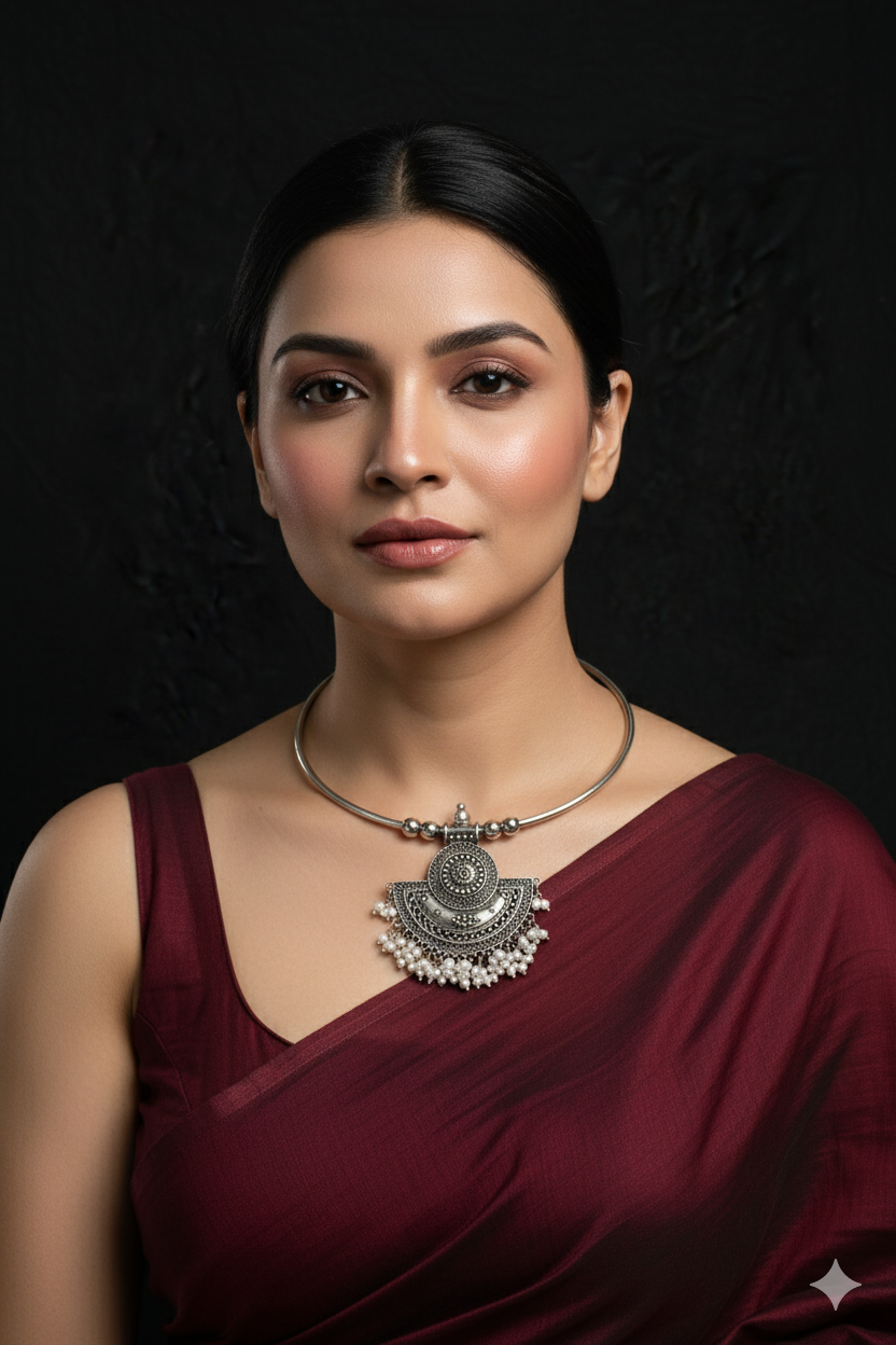 Product Description: Traditional Indian oxidised German silver hansli style necklace with semi-circle engraved pendant with pearl drops. Crafted from durable brass alloy with oxidised silver plating, this statement neckpiece is perfect for ethnic, festive and party wear.