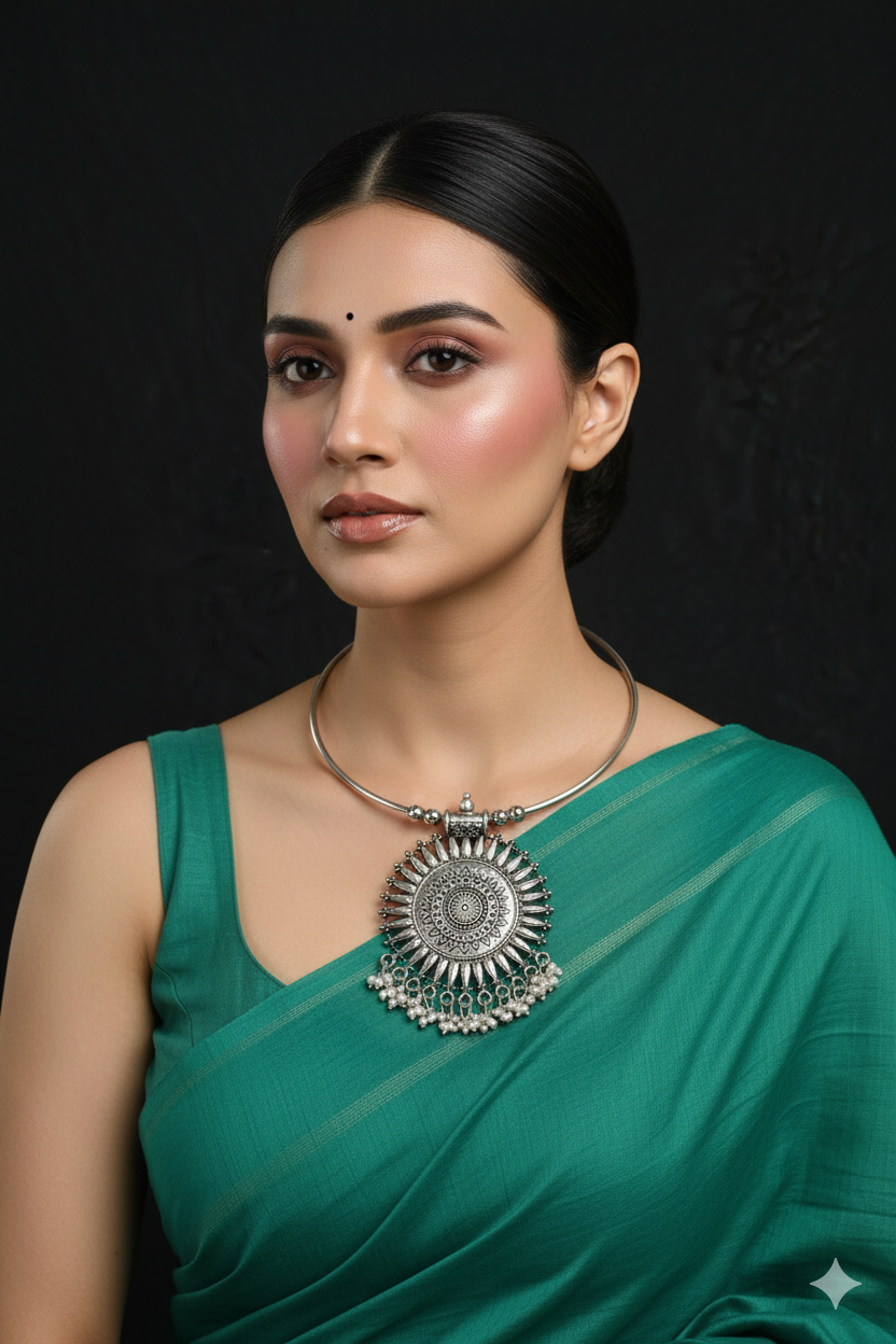 Product Description: Traditional Indian oxidised German silver hansli style necklace with sunburst design pendant with pearl drops. Crafted from durable brass alloy with oxidised silver plating, this statement neckpiece is perfect for ethnic, festive and party wear.