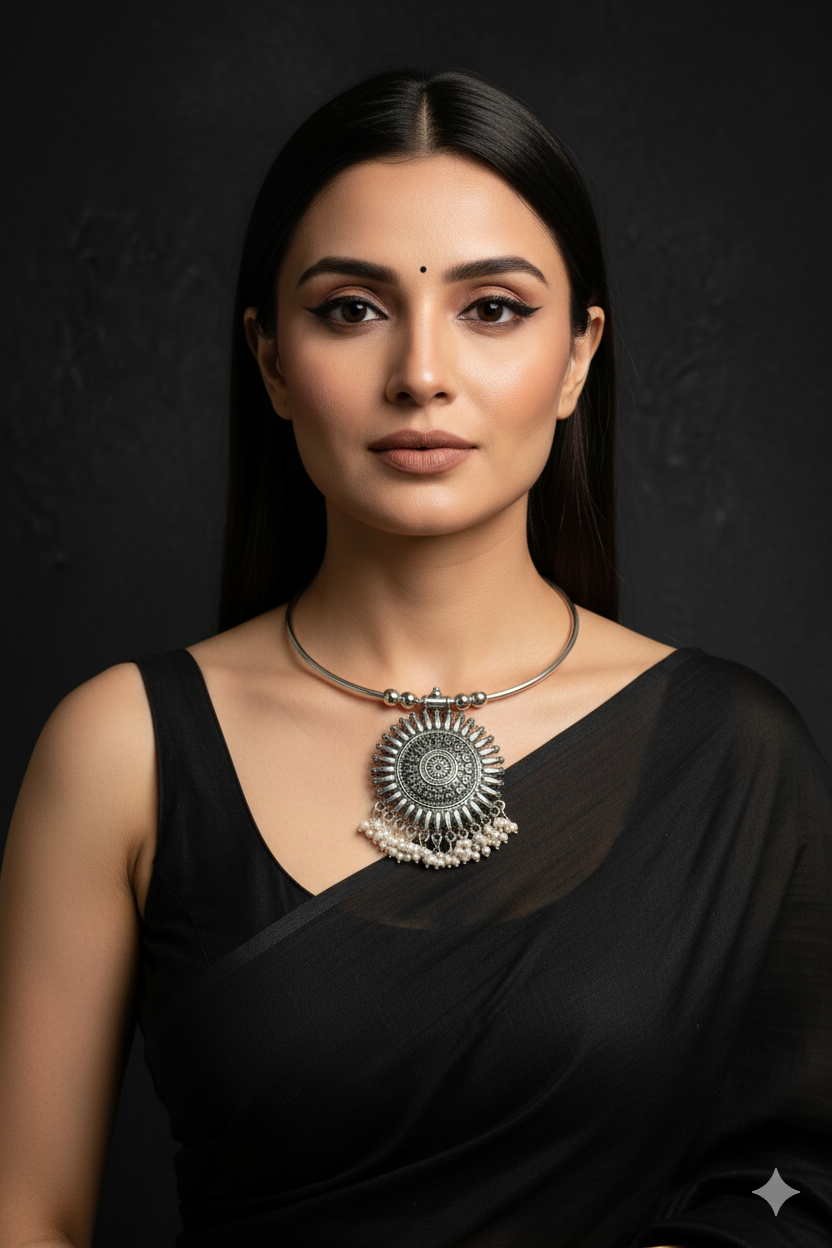 Product Description: Traditional Indian oxidised German silver hansli style necklace with sunburst pendant with pearl fringe. Crafted on a durable brass base with oxidised silver plating, this lightweight statement neckpiece complements sarees, lehengas and kurtas.