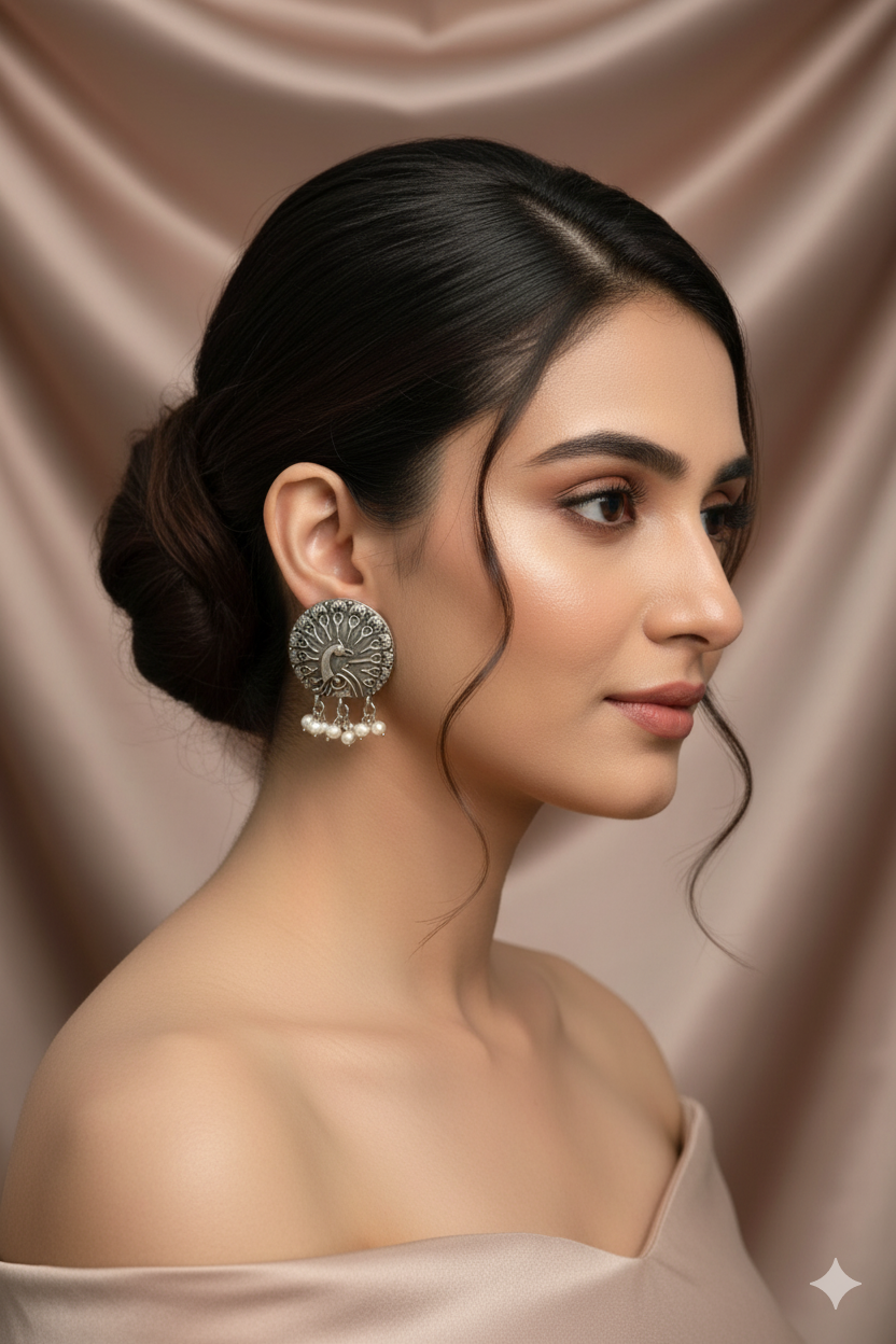 Product Description: Traditional oxidised silver earrings featuring a peacock motif with pearl drops. Perfect for festive occasions and weddings.