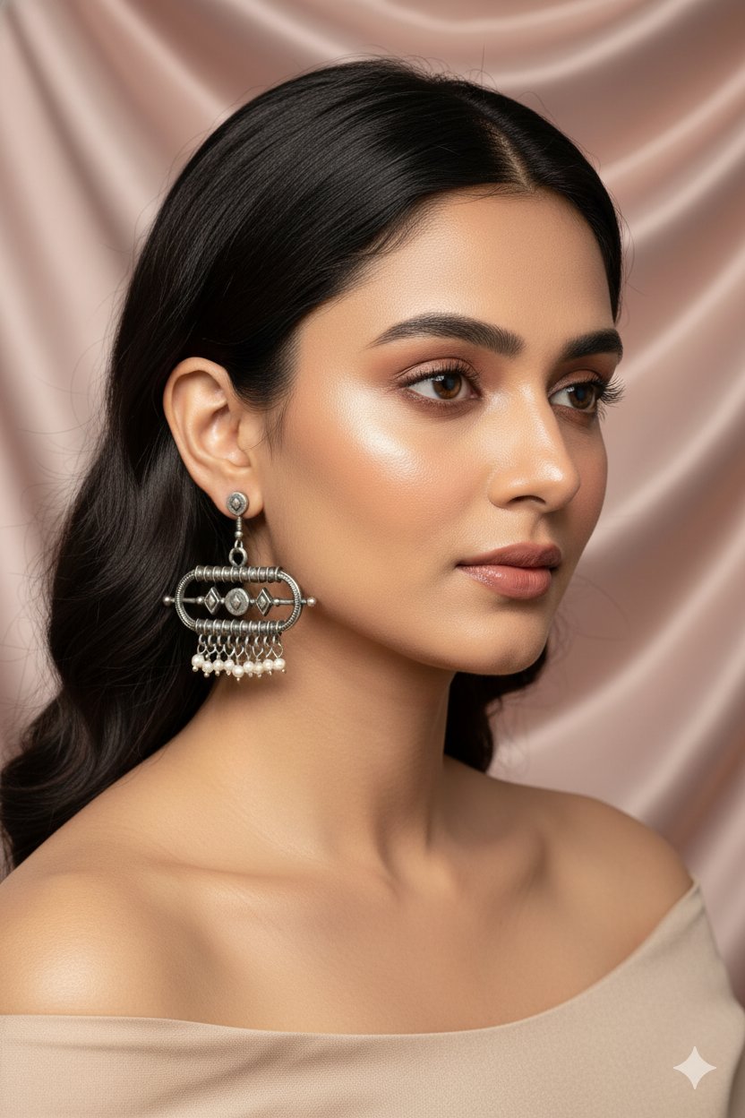 Product Description: Stylish oxidised earrings with rectangular frame design and pearl drops. Lightweight and trendy, suitable for ethnic as well as Indo-western outfits.