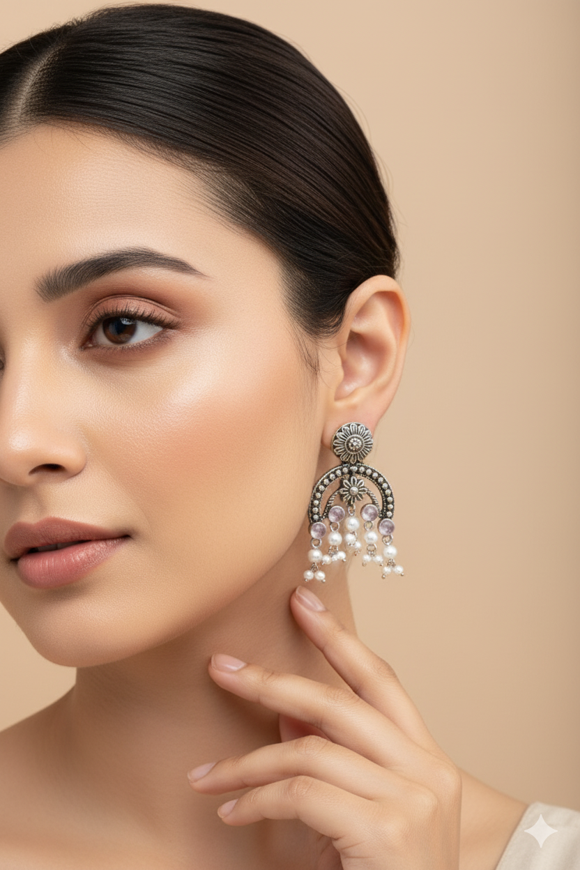 Charming arch‑shaped oxidised earrings with dotted borders, floral centre and round pink Monalisa stones. Finished with dainty pearl drops for a soft festive look.