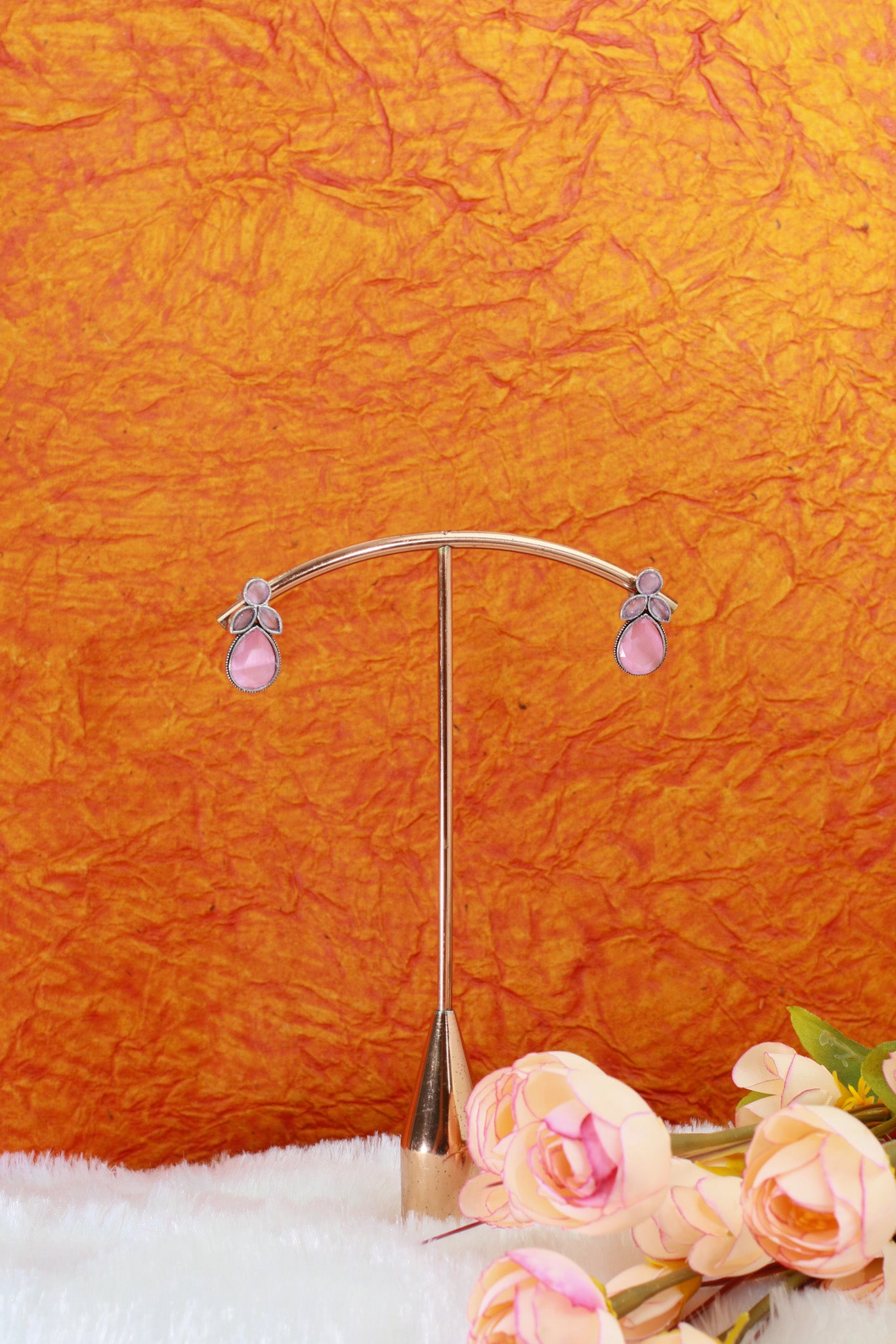 Soft pink Monalisa stones arranged in a delicate cluster with a faceted tear‑drop centerpiece. Minimal yet eye‑catching in oxidised German silver.
