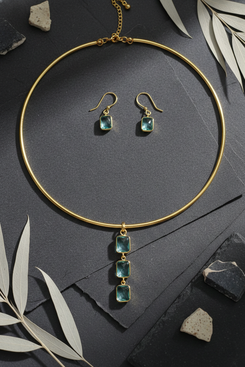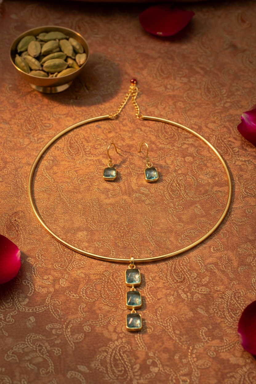 Square Natural Stone Drop Hansuli Choker Necklace – Gold Plated Brass Minimal Statement Jewelry