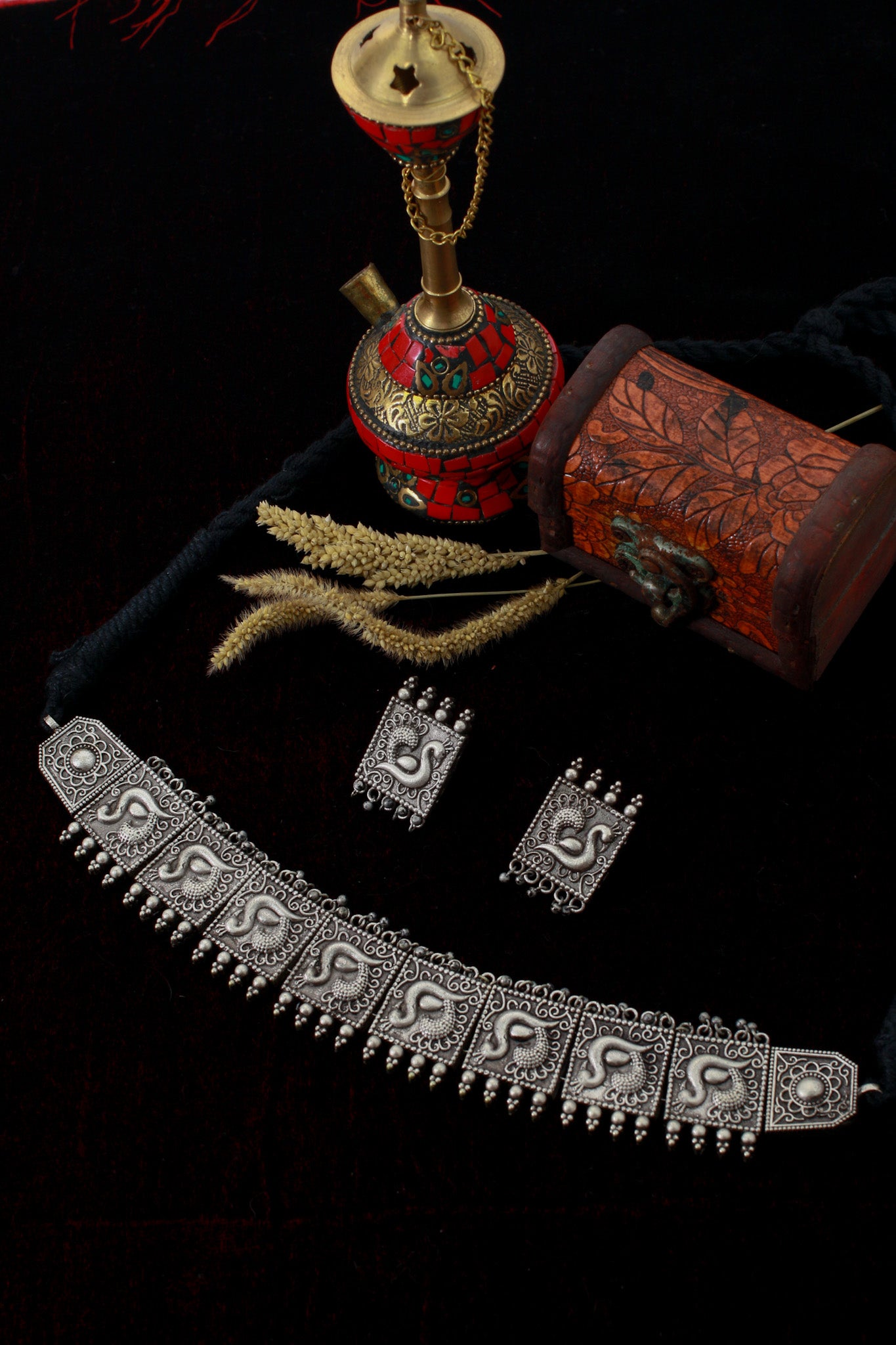 Statement temple choker crafted from oxidised German silver square panels embossed with swan motifs and intricate granulation. Adjustable back tie for a comfortable fit over sarees and festive looks.