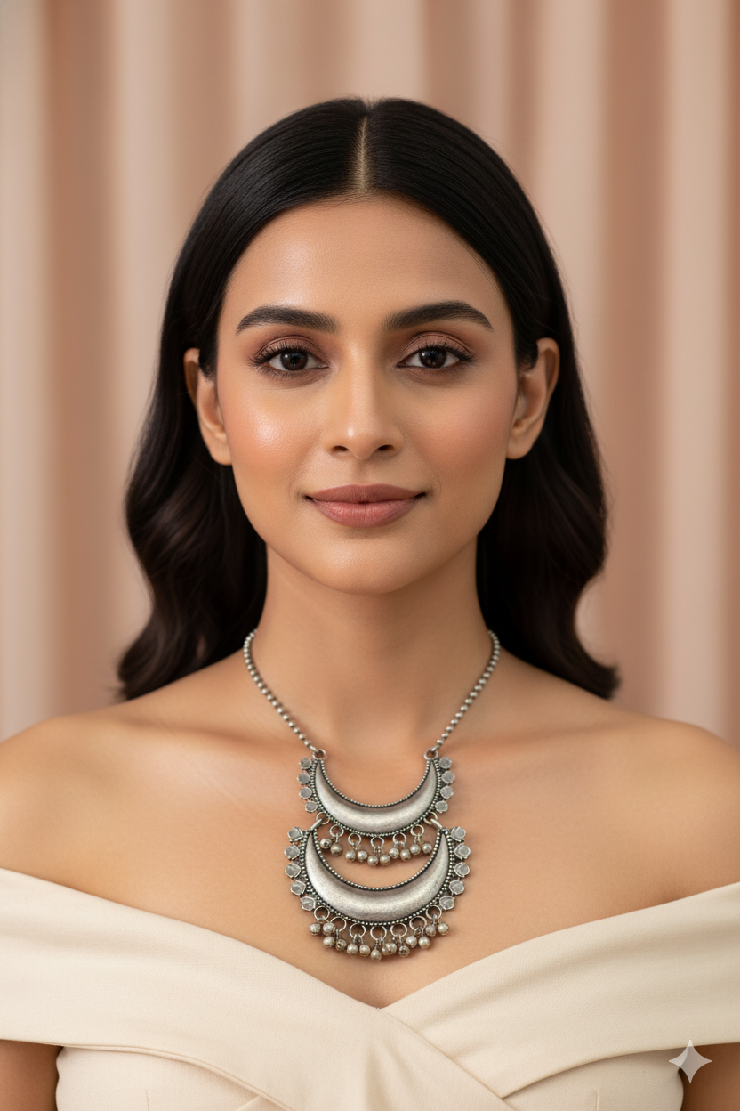 Tribal‑inspired double crescent pendant in oxidised German silver, finished with beaded borders and ghungroo drops. A bold layer‑friendly piece for handloom and fusion outfits.