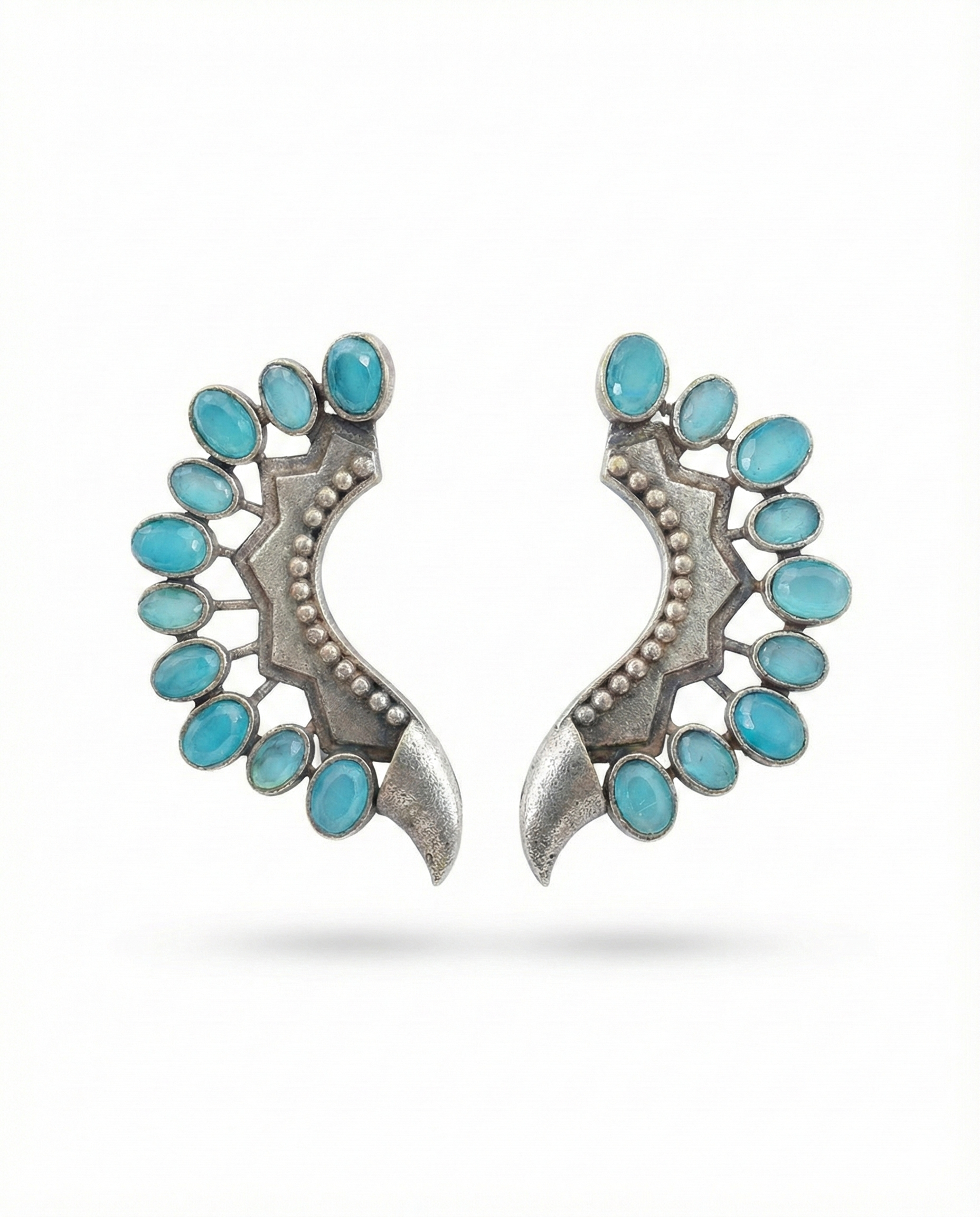 Enhance your ethnic wardrobe with these stunning Turquoise Monalisa Crescent Earrings crafted in premium oxidised German silver. The curved silhouette paired with oval-cut Monalisa stones adds a vibrant and elegant touch.