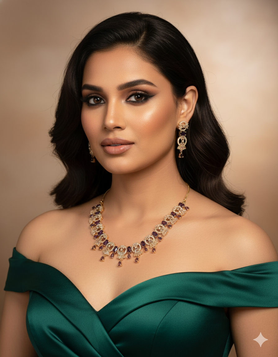 Featuring bold golden metalwork and deep plum stones, this set blends antique charm with modern elegance. Square and teardrop gemstones alternate through a golden filigree framework, paired with matching earrings that mirror the necklace’s signature oval motif.