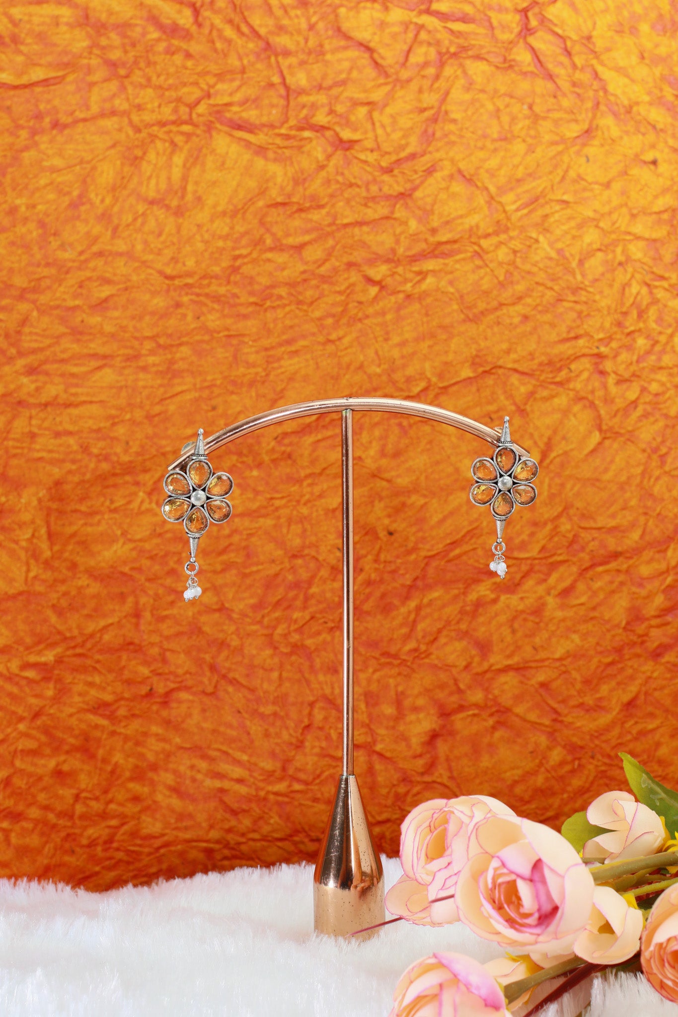 Sunny floral earrings featuring six petal-set yellow Monalisa stones with a petite pearl drop. Bright, cheerful and perfect for day events.