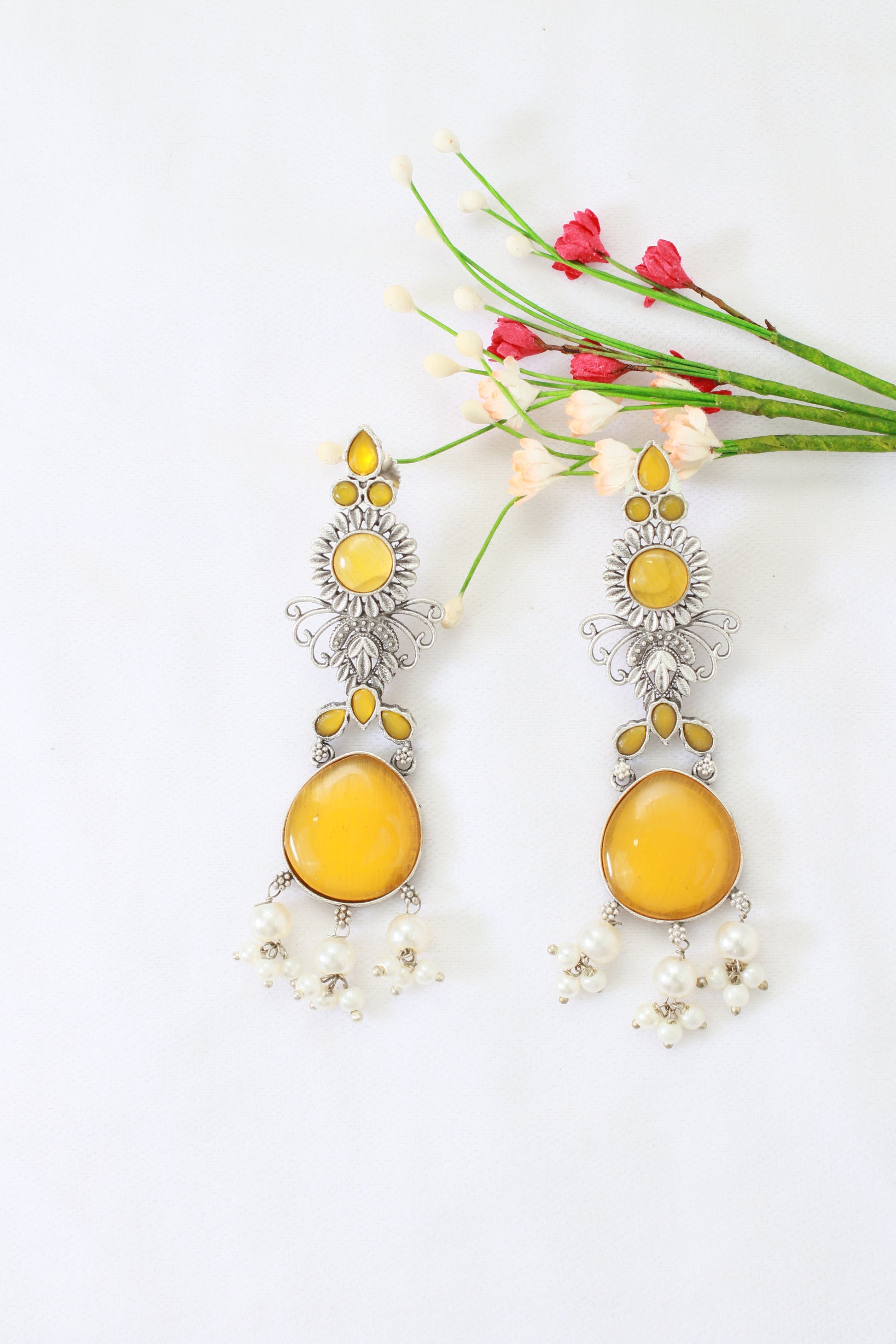 These long oxidised German silver earrings are designed with stunning yellow Monalisa stones, floral motifs, and delicate pearl danglers. The handcrafted detailing makes them perfect for festive and ethnic occasions.